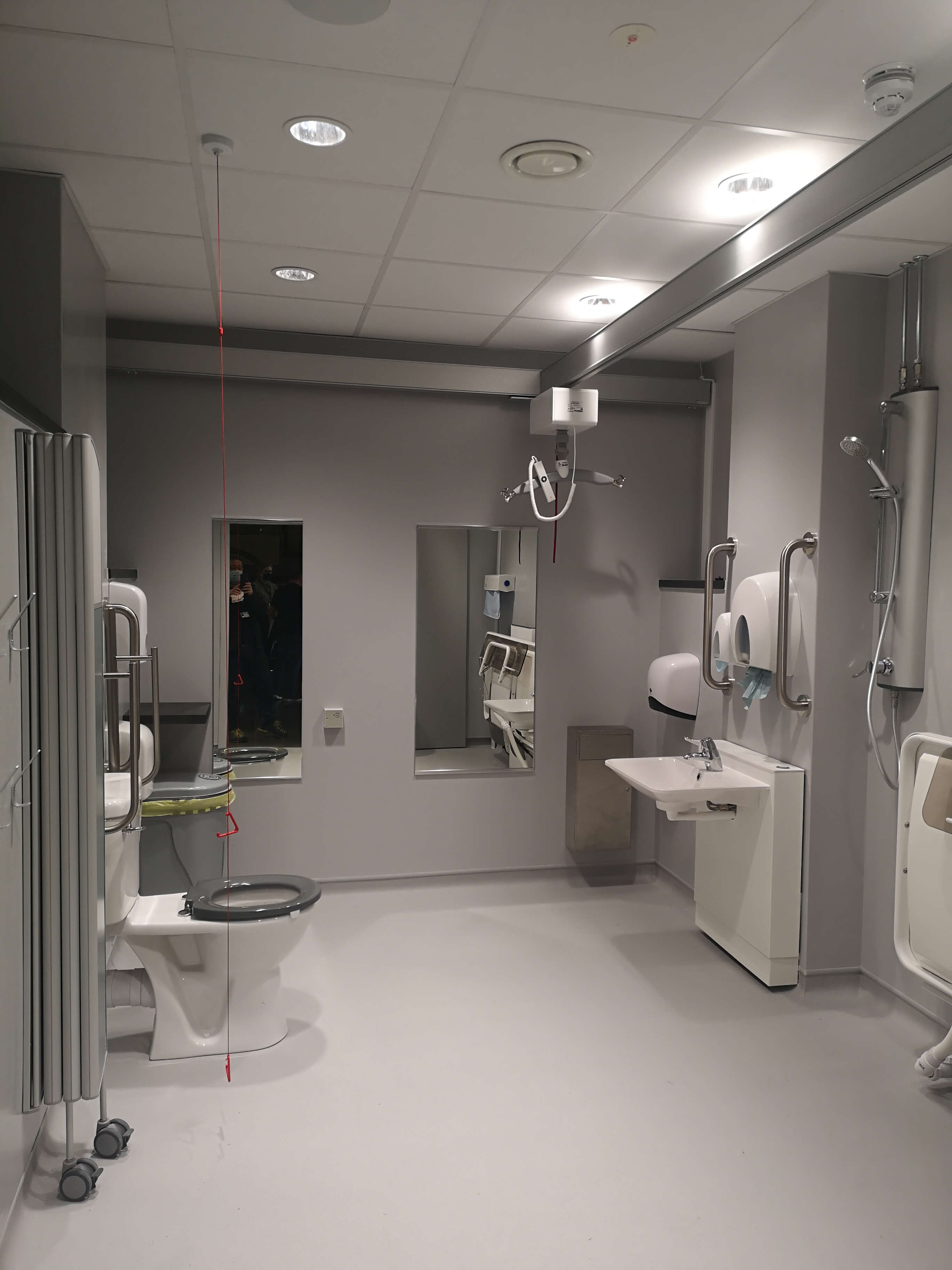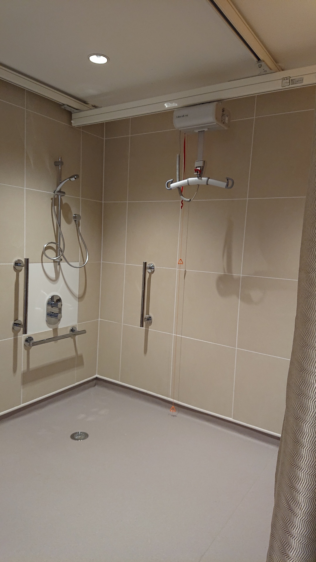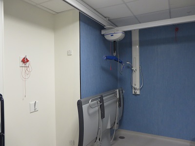 FACILITIES: Bench – Height Adjustable, Adult Sized, Free Standing | Hoist – Ceiling | Peninsular Toilet | Height Adjustable Washbasin | Non-Slip Floor | Floor Space (sq. m) – 10 | Emergency Alarm | Privacy Screen | Paper Roll Managed | Accessible Shower | Colostomy Shelf