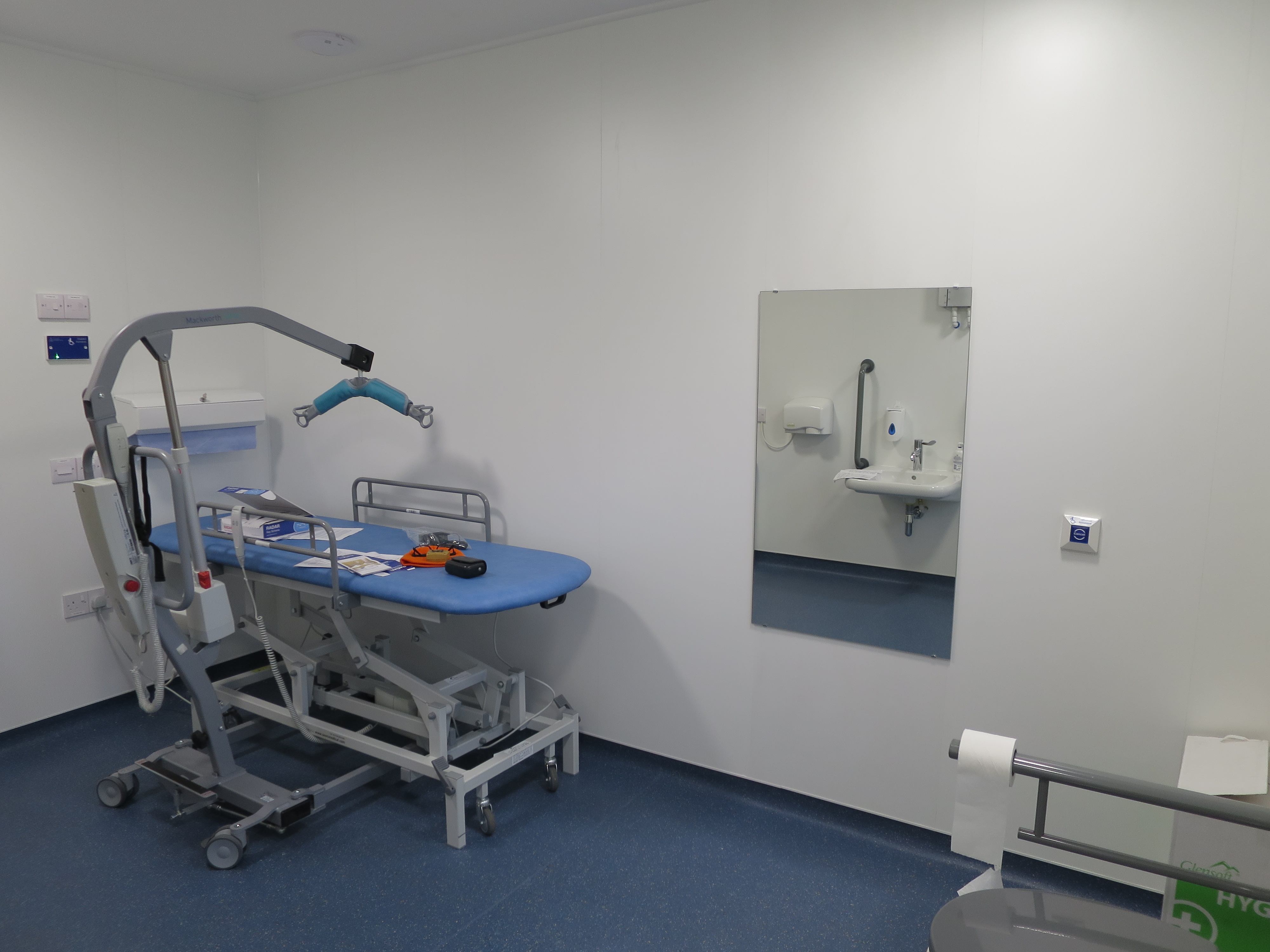 FACILITIES: Bench – Height Adjustable, Adult Sized, Free Standing | Hoist – Mobile | Peninsular Toilet | Non-Slip Floor | Floor Space (sq. m) – 13 | Emergency Alarm | Privacy Screen | Paper Roll Managed | Colostomy Shelf