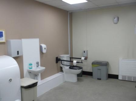 FACILITIES: Bench – Height Adjustable, Adult Sized, Free Standing | Hoist – Ceiling | Peninsular Toilet | Non-Slip Floor | Emergency Alarm | Privacy Screen | Paper Roll | Managed