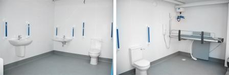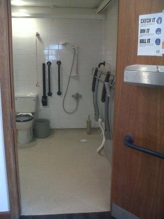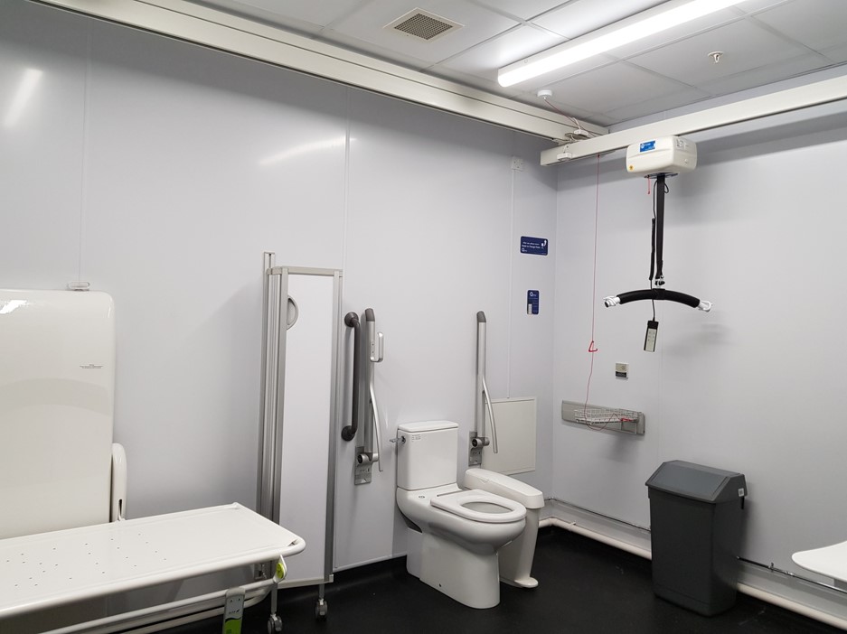 FACILITIES: Bench – Height Adjustable, Adult Sized, Free Standing | Hoist – Ceiling | Peninsular Toilet | Height Adjustable Washbasin | Non-Slip Floor | Emergency Alarm | Privacy Screen | Paper Roll | Managed | Locked