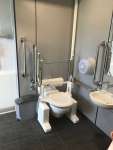 FACILITIES: Bench – Height Adjustable, Adult Sized, Free Standing | Hoist – Ceiling | Peninsular Toilet | Non-Slip Floor | Floor Space (sq. m) – 12 | Emergency Alarm | Privacy Screen | Paper Roll | Radar Key | Managed | Locked Accessible Shower
