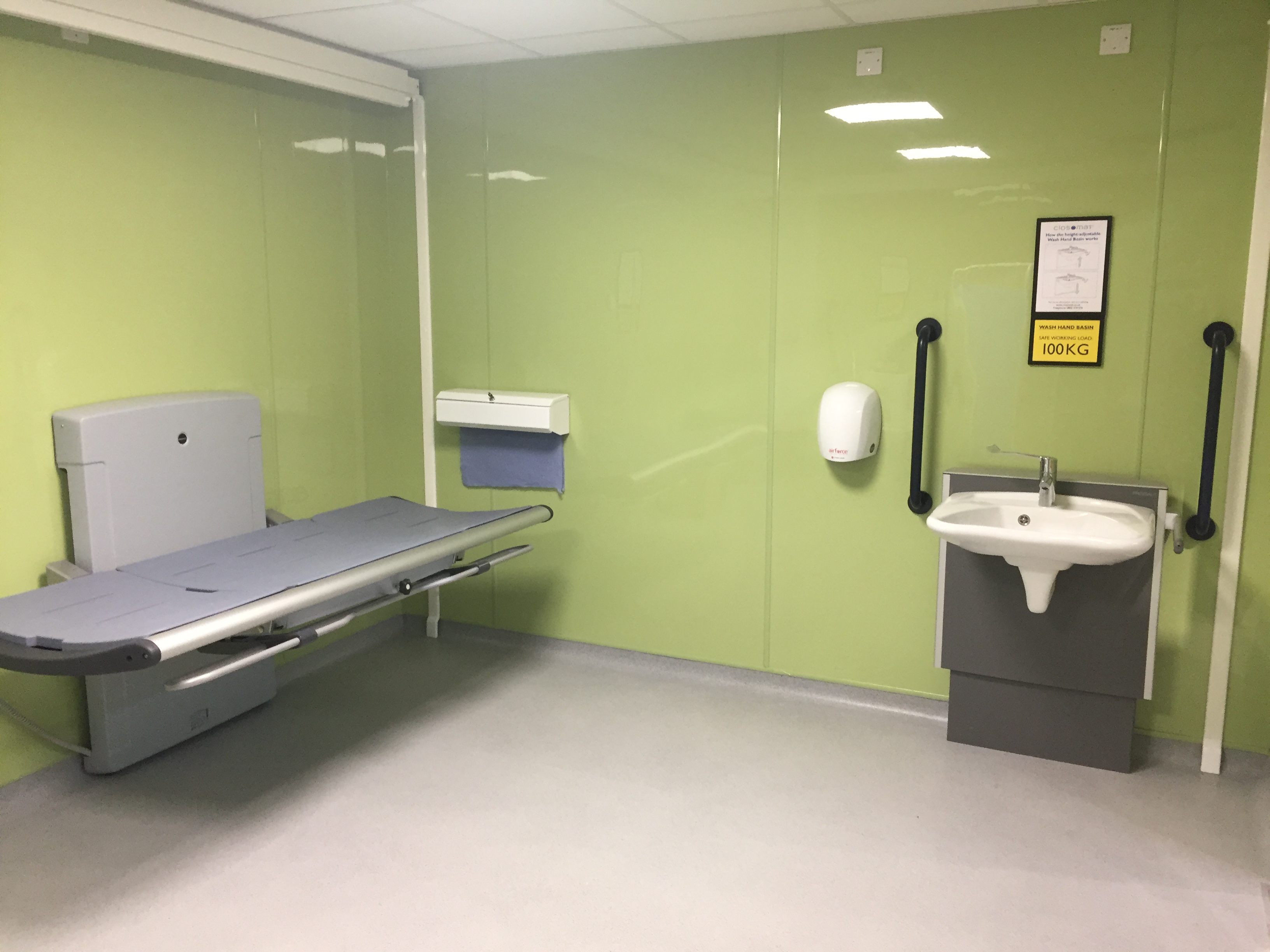 FACILITIES: Bench – Height Adjustable, Adult Sized, Free Standing | Hoist – Ceiling | Peninsular Toilet | Height Adjustable Washbasin | Non-Slip Floor | Floor Space (sq. m) – 13 | Emergency Alarm | Paper Roll | Managed Locked | Accessible Shower | Colostomy Shelf