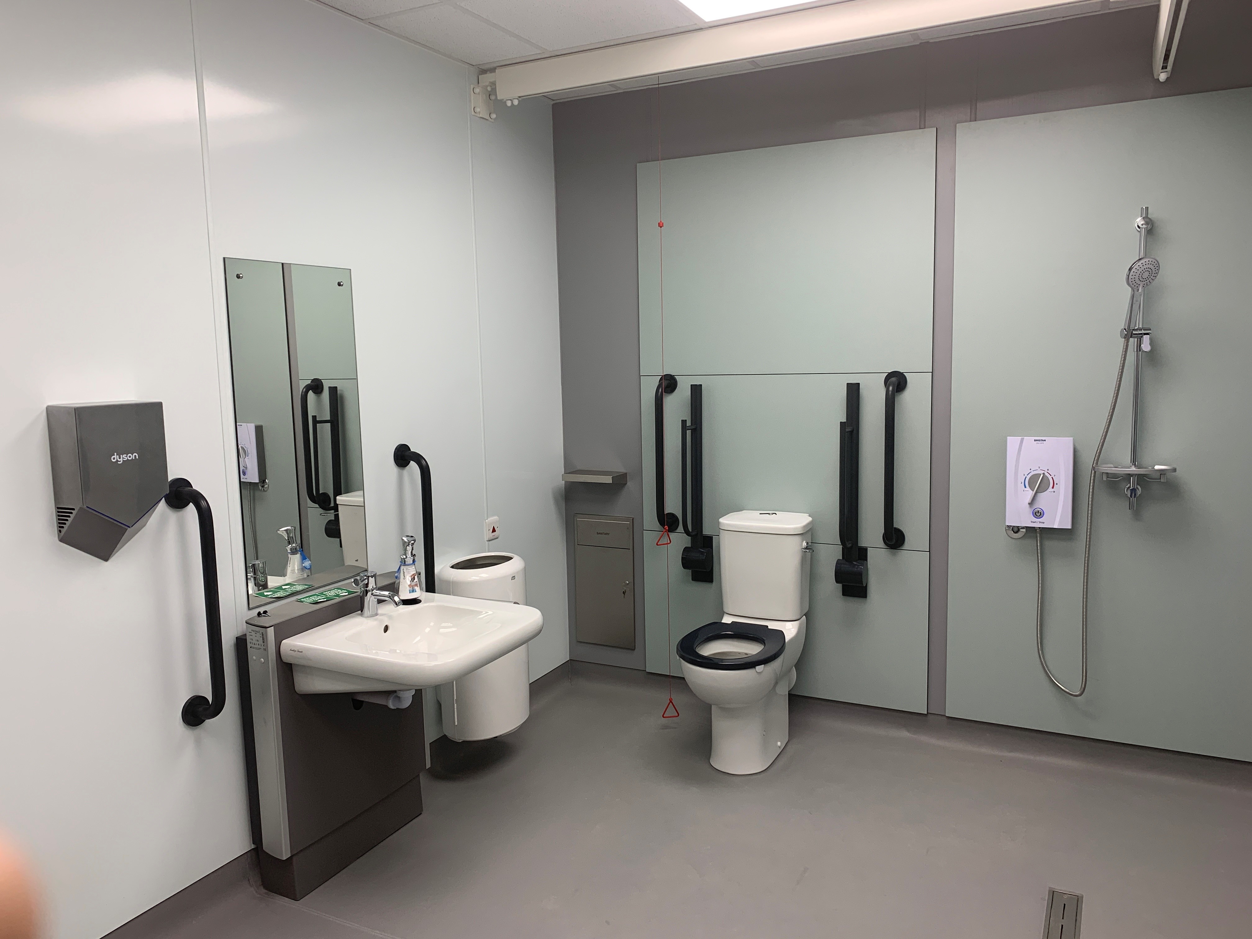 FACILITIES: Bench – Height Adjustable, Adult Sized, Wall Mounted | Hoist – Ceiling | Peninsular Toilet | Height Adjustable Washbasin | Non-Slip Floor | Floor Space (sq. m) – 16 | Emergency Alarm | Privacy Screen | Paper Roll Managed | Locked | Accessible Shower | Colostomy Shelf