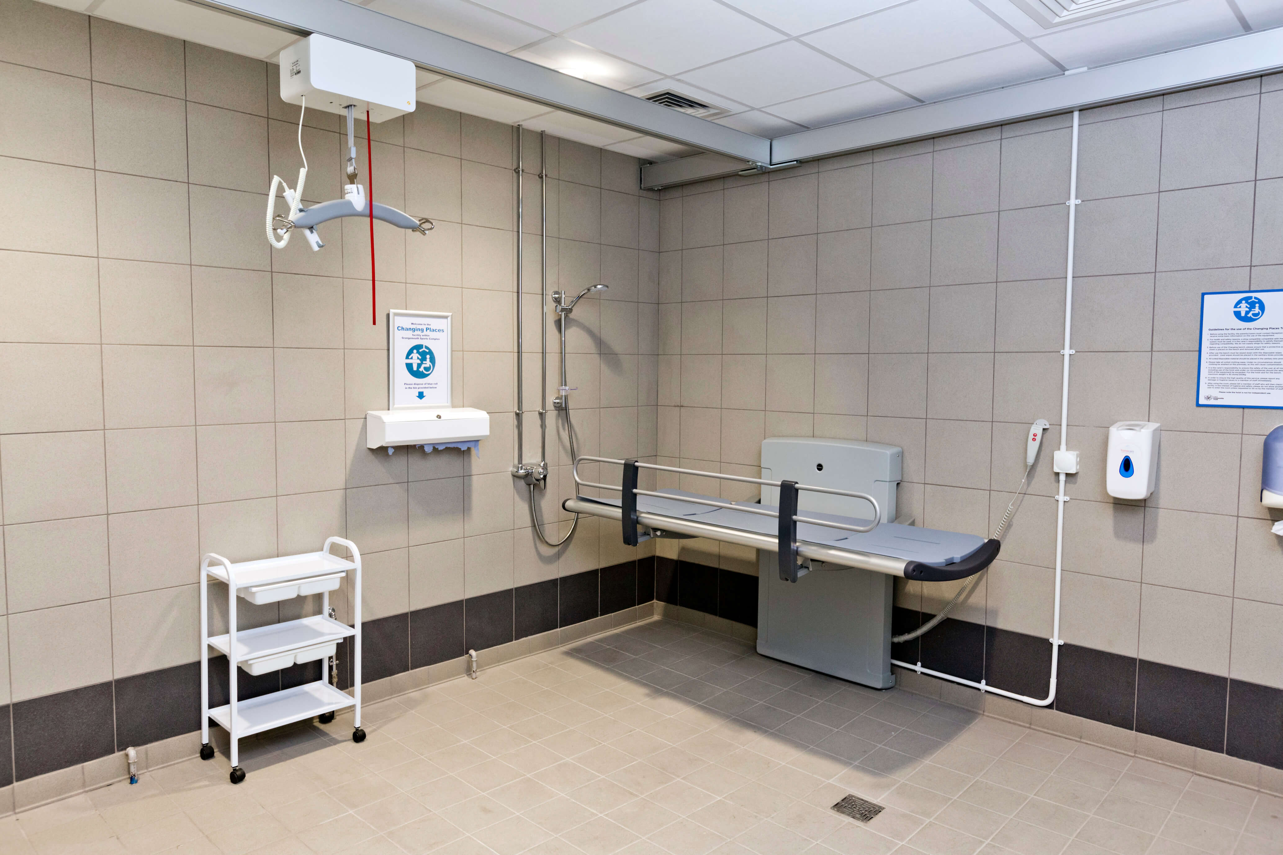 FACILITIES: Bench – Height Adjustable, Adult Sized, Free Standing | Hoist – Ceiling | Wash & Dry Toilet | Non-Slip Floor | Floor Space (sq. m) – 12 | Emergency Alarm | Privacy Screen | Paper Roll | Managed | Accessible Shower