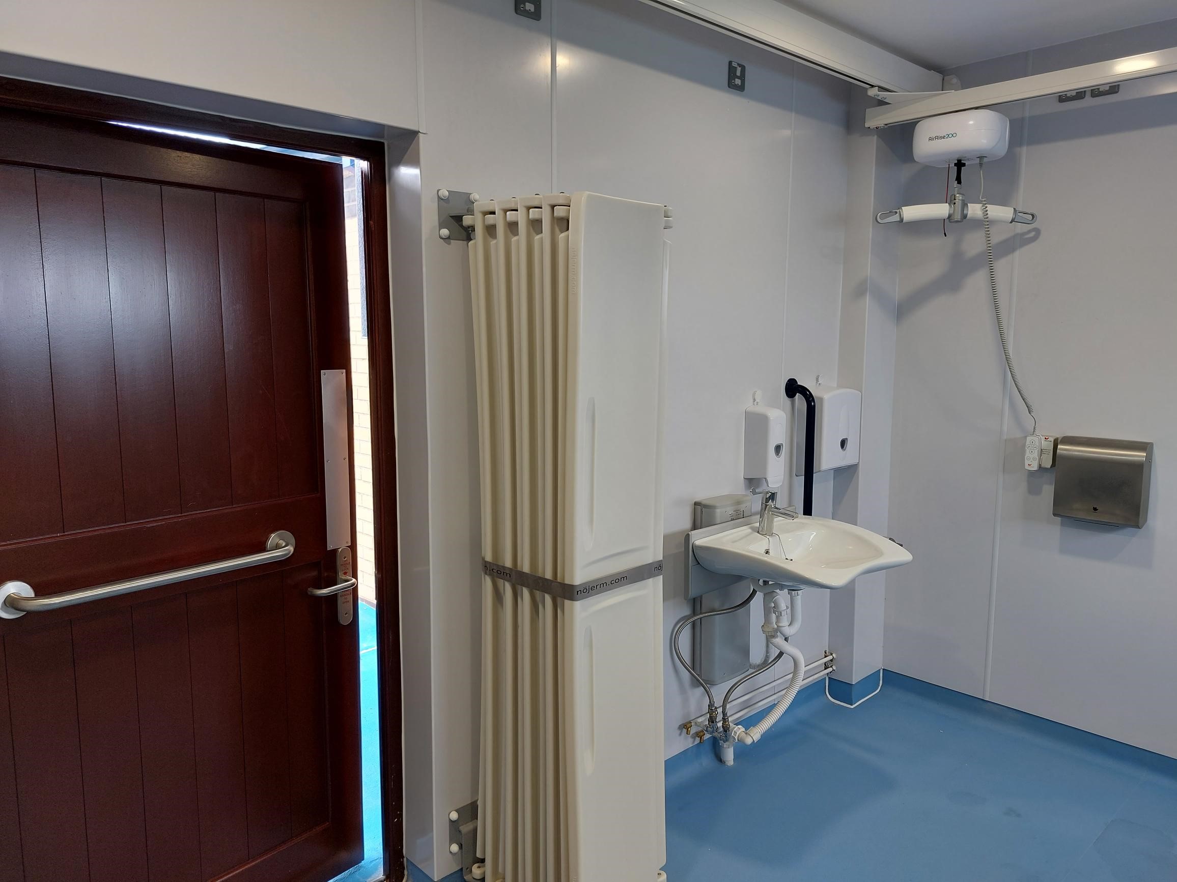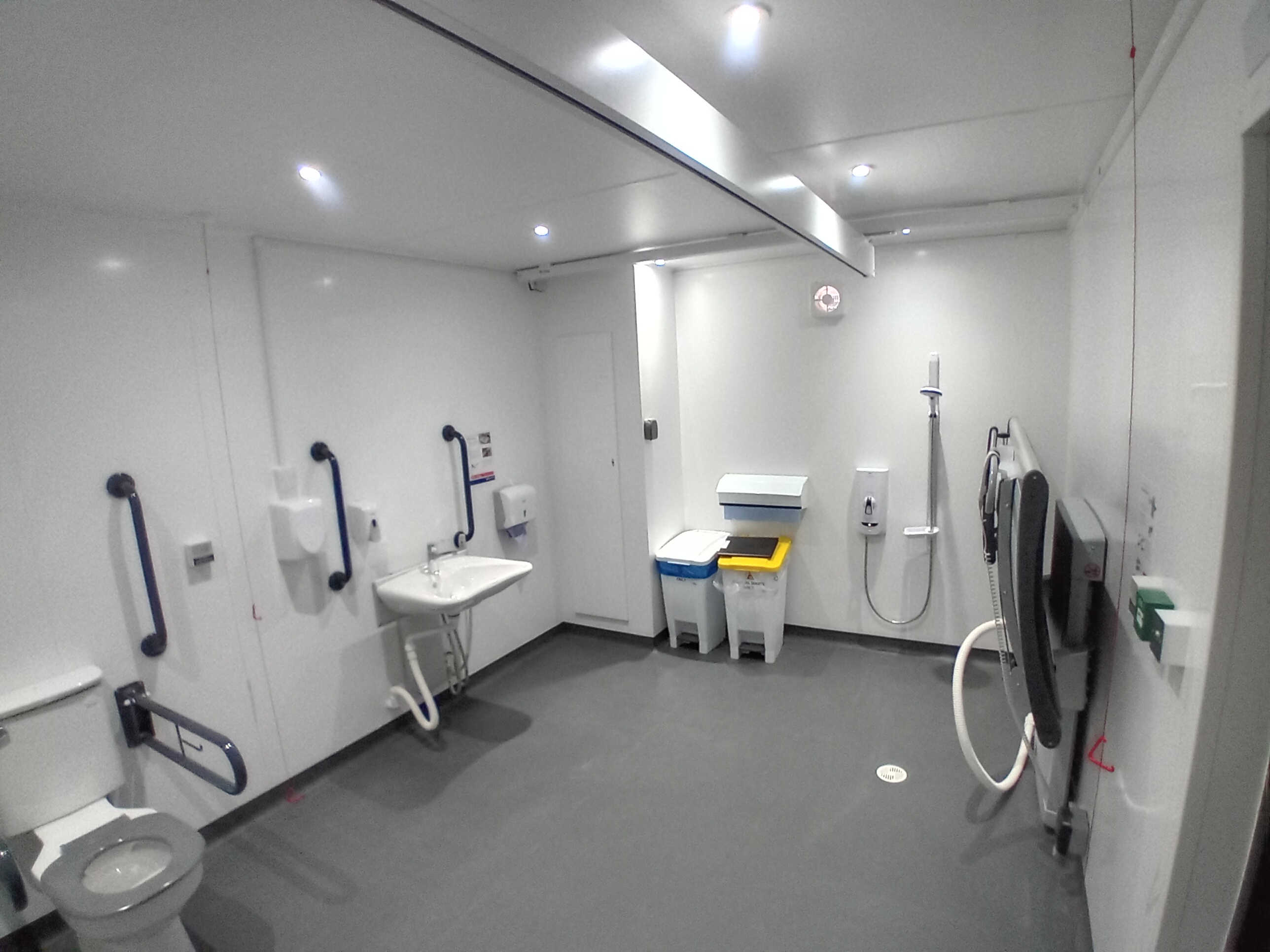 FACILITIES: Bench – Height Adjustable, Adult Sized, Free Standing | Hoist – Ceiling | Peninsular Toilet | Height Adjustable Washbasin | Non-Slip Floor | Floor Space (sq. m) – 13 | Emergency Alarm | Privacy Screen | Paper Roll Radar Key | Managed | Locked