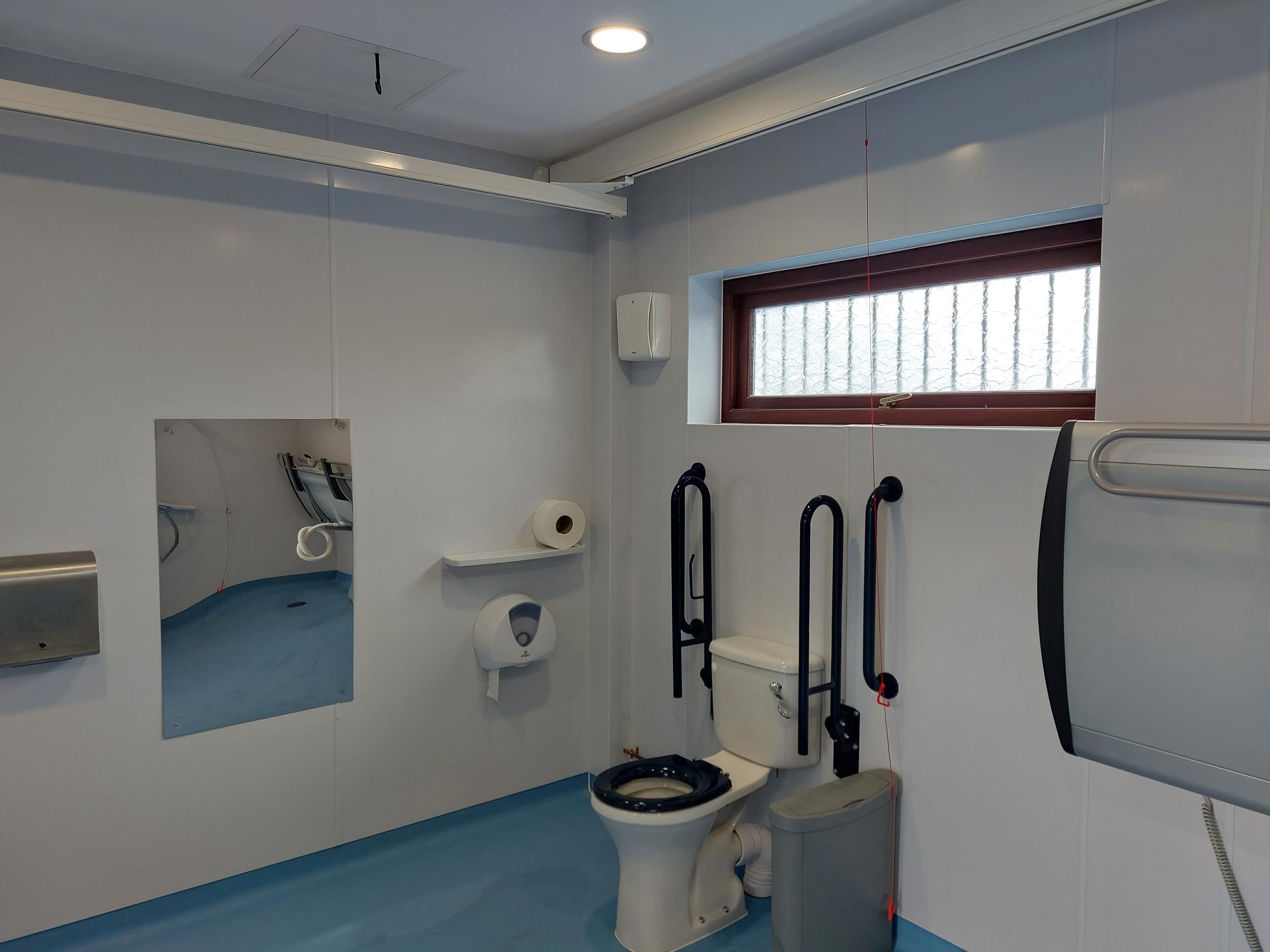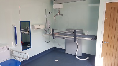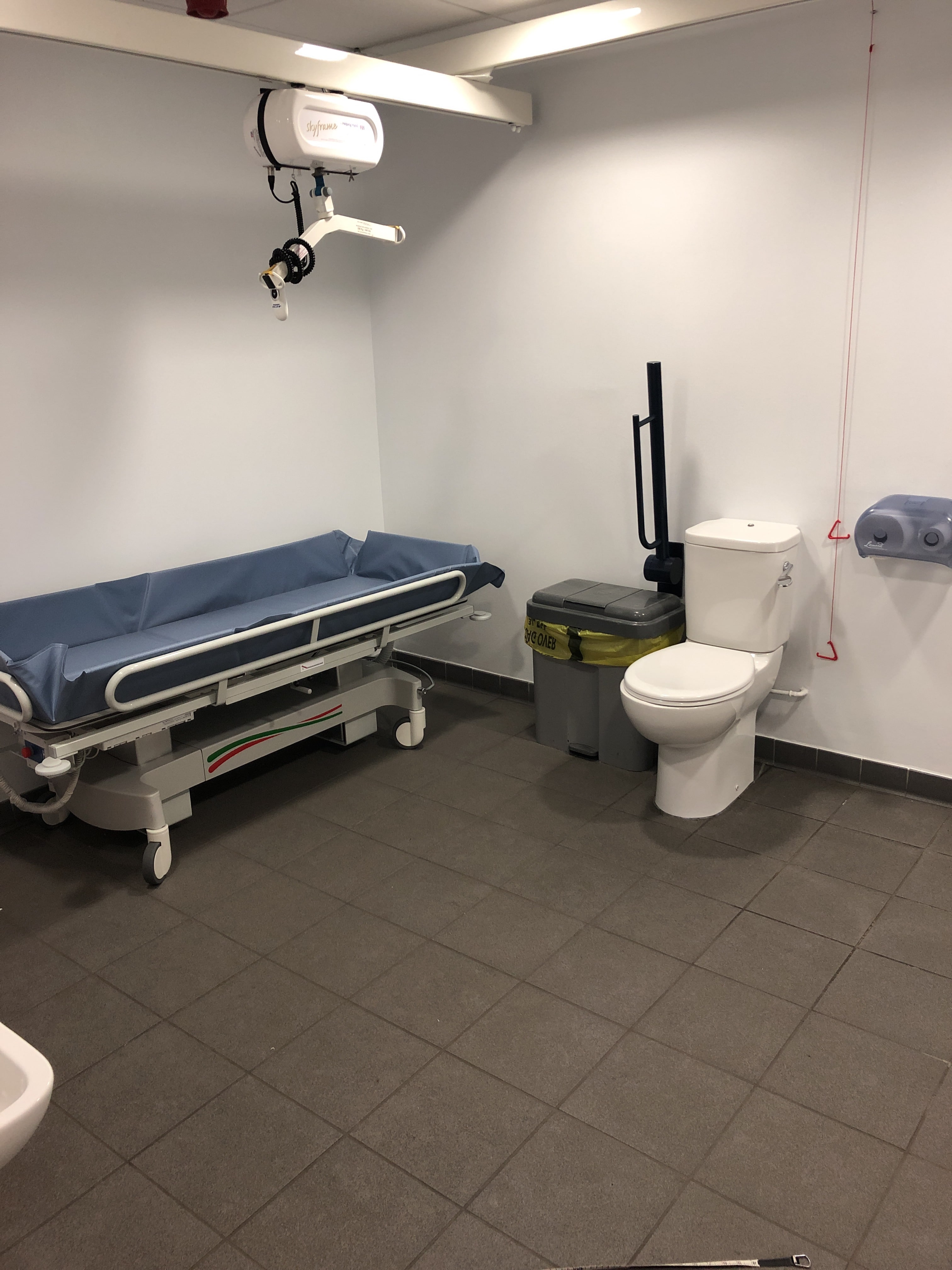 FACILITIES: Bench – Height Adjustable, Adult Sized, Free Standing | Hoist – Mobile | Peninsular Toilet | Height Adjustable Washbasin | Non-Slip Floor | Floor Space (sq. m) – 7.0 | Emergency Alarm | Privacy Screen | Paper Roll Managed