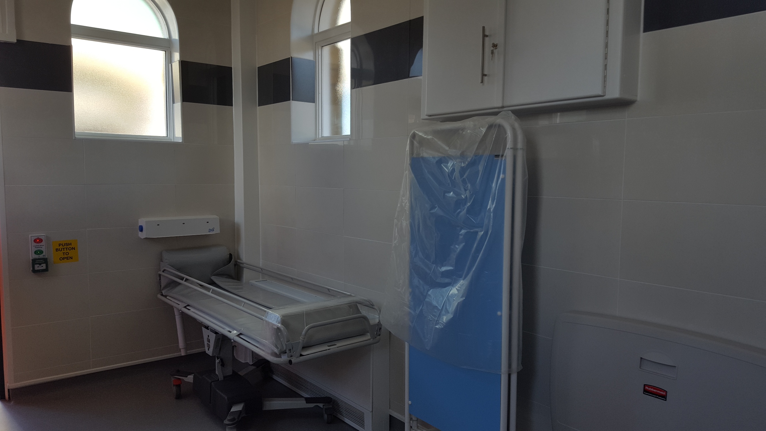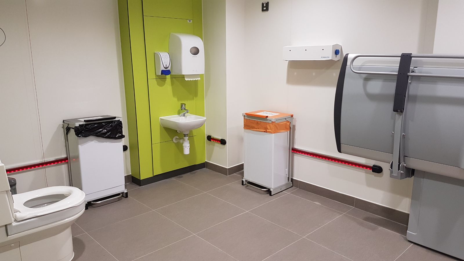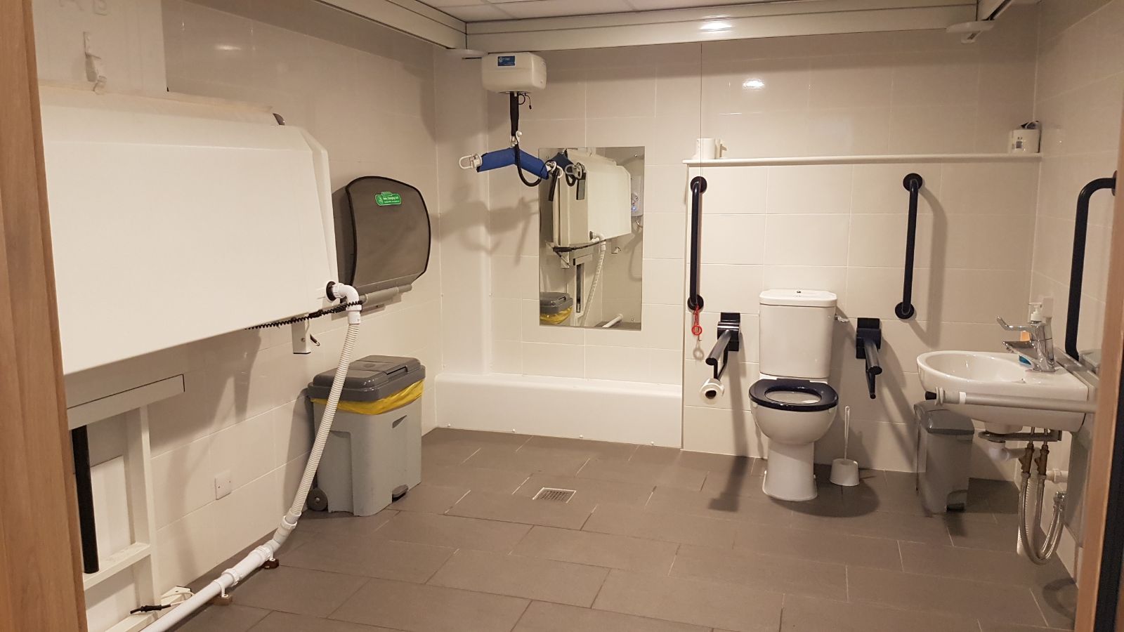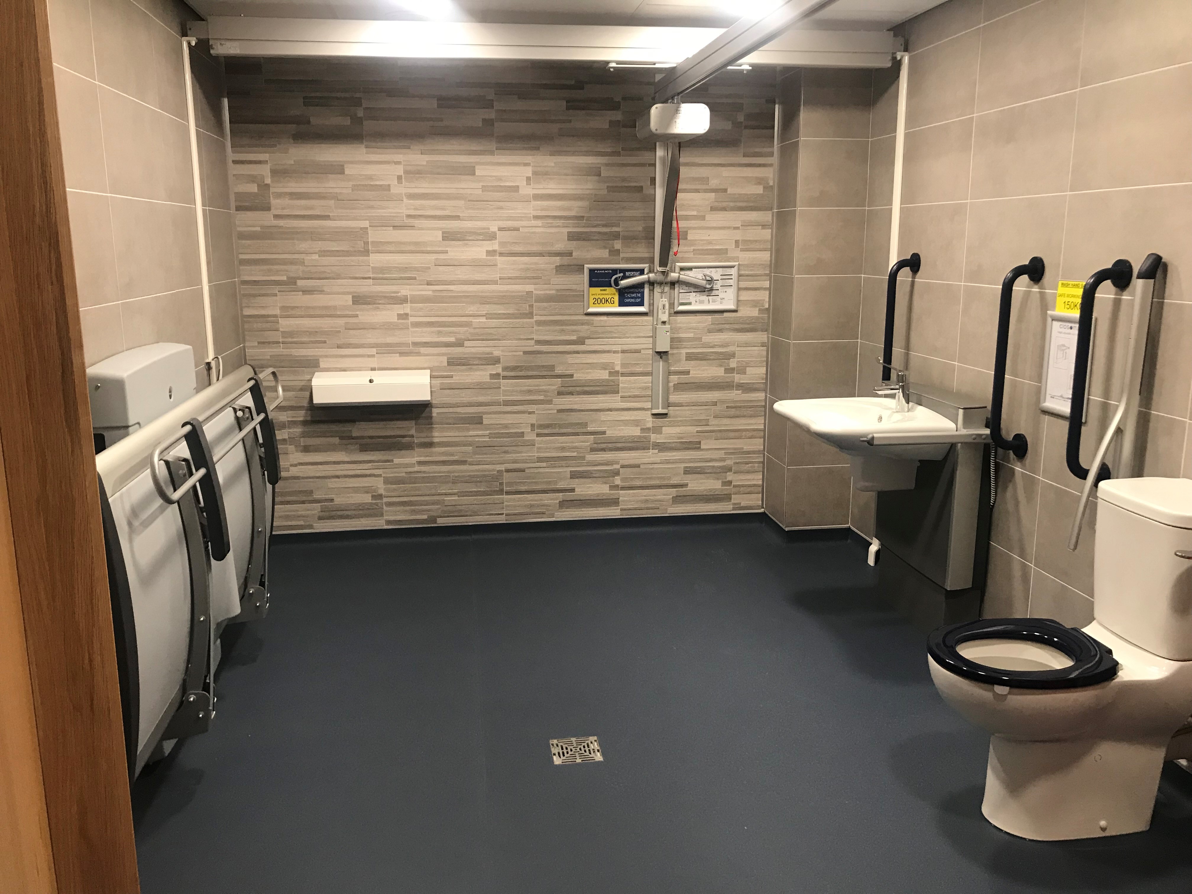 FACILITIES: Bench – Height Adjustable, Adult Sized, Wall Mounted | Hoist – Ceiling | Peninsular Toilet | Height Adjustable Washbasin | Non-Slip Floor | Floor Space (sq. m) – 12 | Emergency Alarm | Privacy Screen | Paper Roll Managed | Locked | Colostomy Shelf