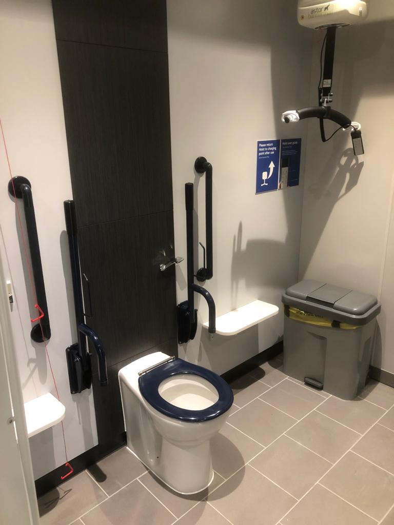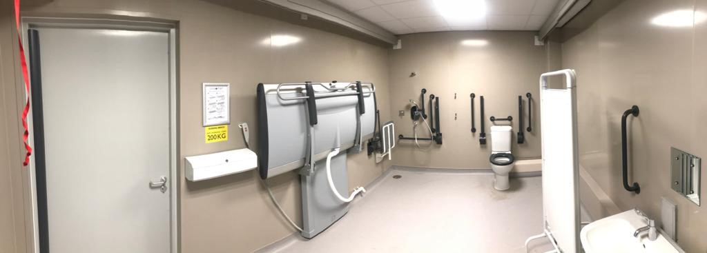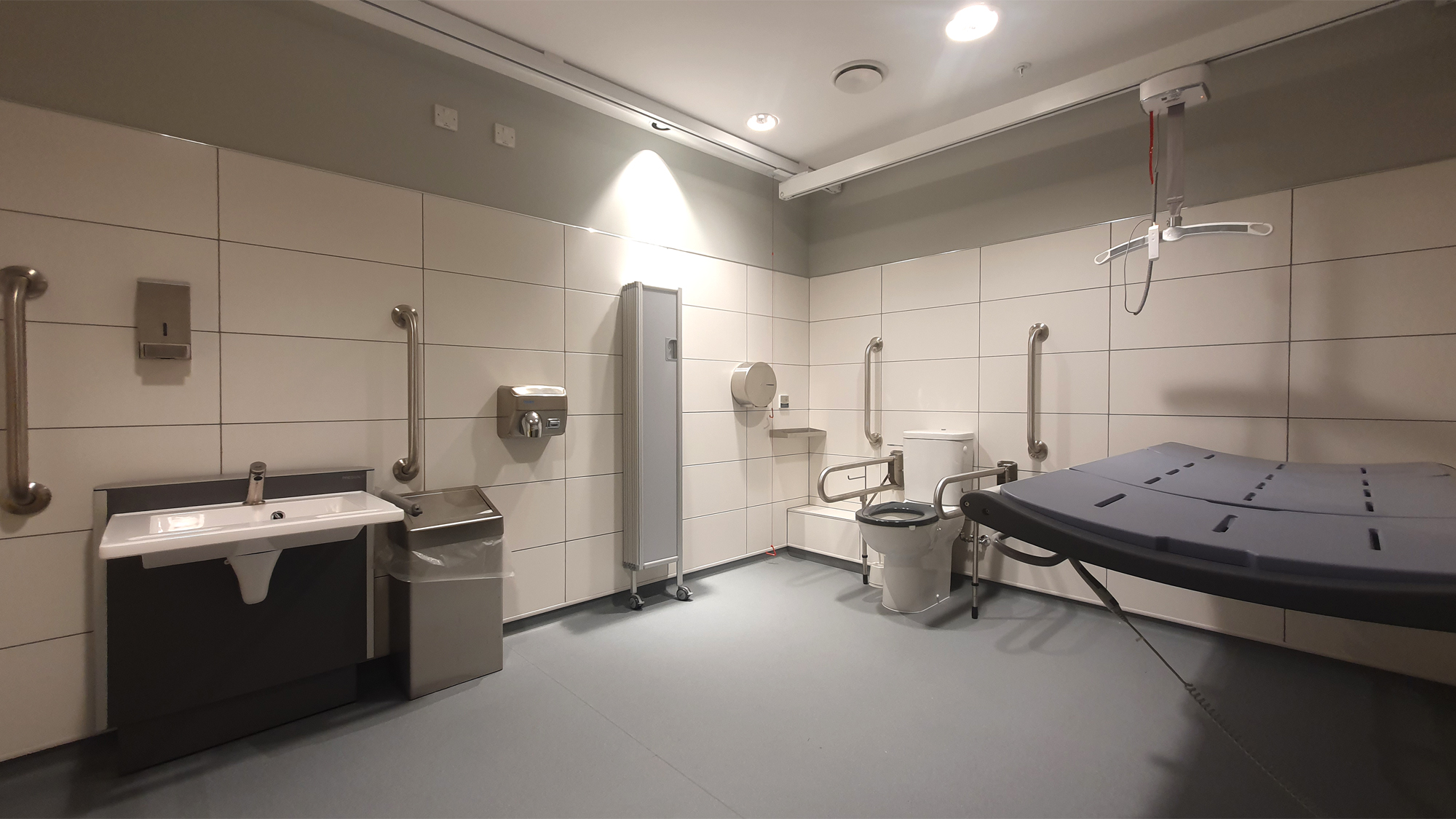 FACILITIES: Bench – Height Adjustable, Adult Sized, Free Standing | Hoist – Ceiling | Peninsular Toilet | Height Adjustable Washbasin | Non-Slip Floor | Floor Space (sq. m) – 11 | Emergency Alarm | Privacy Screen | Paper Roll Radar Key | Managed | Locked | Colostomy Shelf