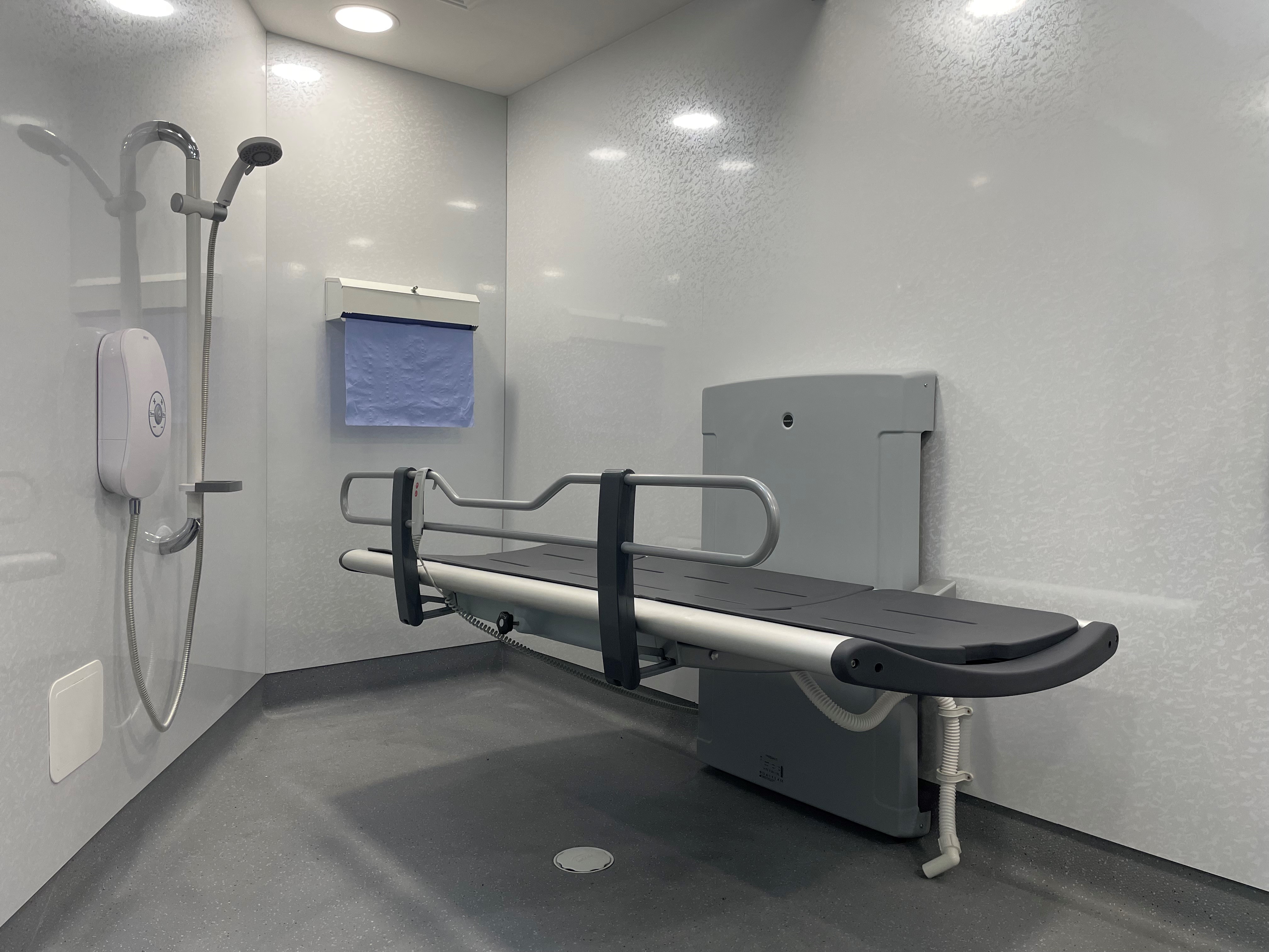 FACILITIES: Bench – Height Adjustable, Adult Sized, Free Standing | Hoist – Ceiling | Wash & Dry Toilet | Height Adjustable Washbasin | Non-Slip Floor | Emergency Alarm | Privacy Screen | Paper Roll | Managed
