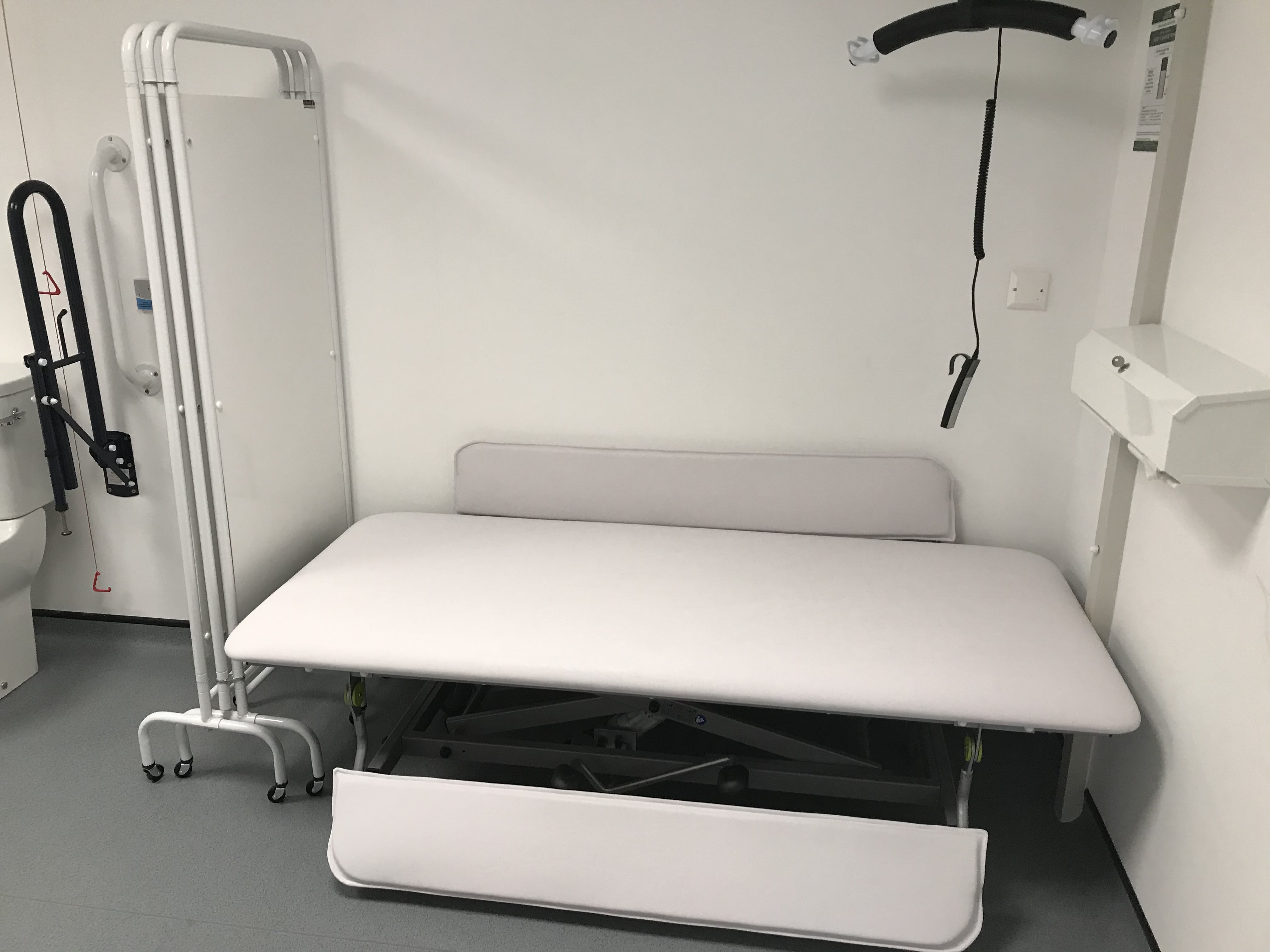 FACILITIES: Bench – Height Adjustable, Adult Sized, Free Standing | Hoist – Ceiling | Peninsular Toilet | Non-Slip Floor | Floor Space (sq. m) – 12 | Emergency Alarm | Paper Roll | Managed