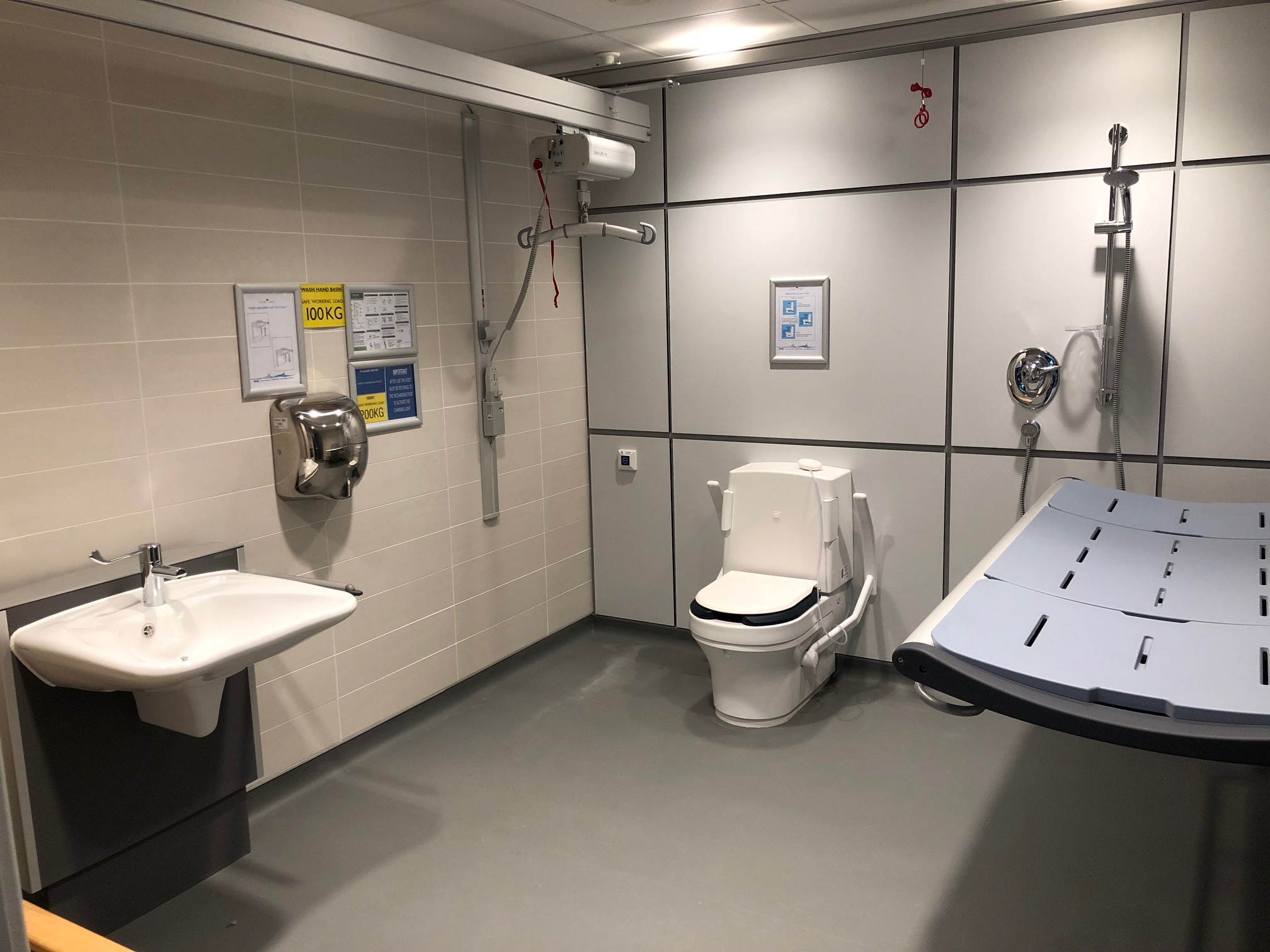 FACILITIES: Bench – Height Adjustable, Adult Sized, Free Standing | Hoist – Mobile | Peninsular Toilet | Non-Slip Floor Floor | Space (sq. m) – 9 | Emergency Alarm | Privacy Screen | Paper Roll | Radar Key | Managed | Locked