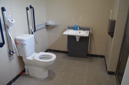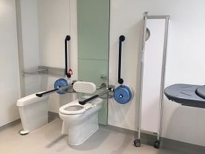 FACILITIES: Bench – Height Adjustable, Adult Sized, Wall Mounted | Hoist – Ceiling | Peninsular Toilet | Height Adjustable Washbasin | Non-Slip Floor | Floor Space (sq. m) – 10 | Emergency Alarm | Privacy Screen | Paper Roll Managed | Locked | Colostomy Shelf