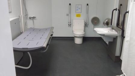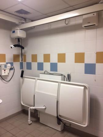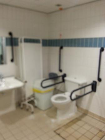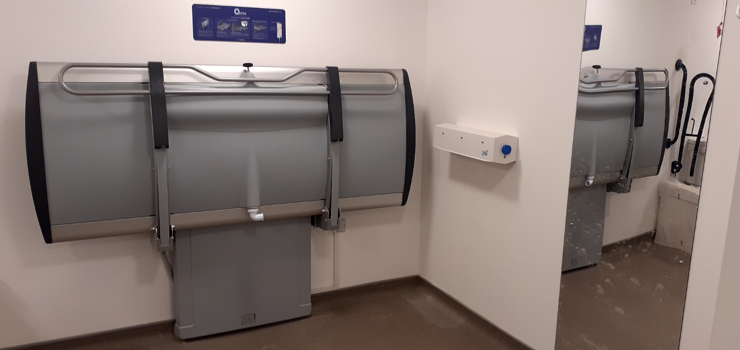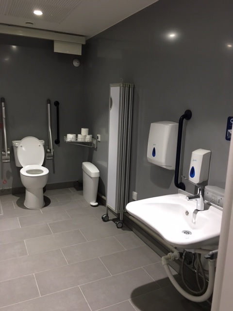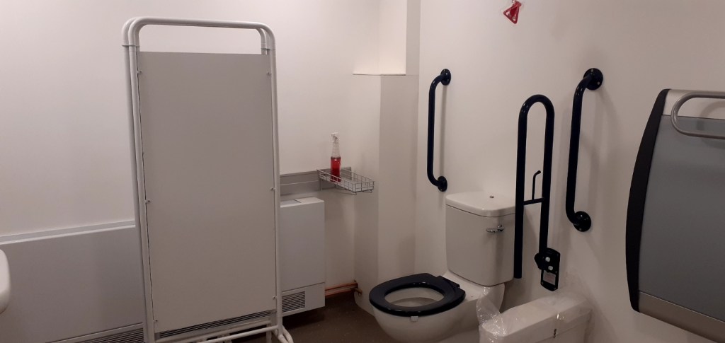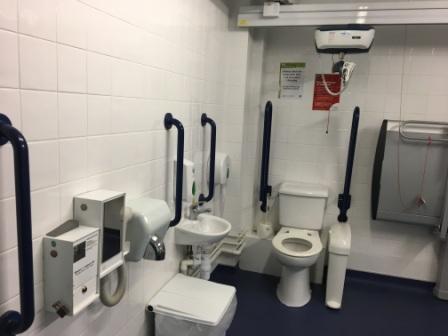 FACILITIES: Bench – Height Adjustable, Adult Sized, Free Standing | Hoist – Ceiling | Peninsular Toilet | Height Adjustable Washbasin | Non-Slip Floor | Floor Space (sq. m) – 11 | Emergency Alarm | Privacy Screen | Paper Roll Radar Key | Managed | Locked | Colostomy Shelf
