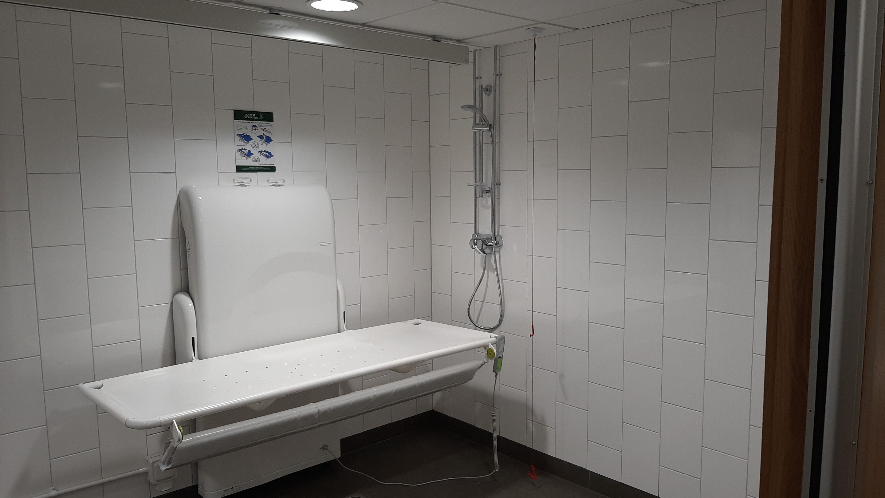 FACILITIES: Bench – Height Adjustable, Adult Sized, Free Standing | Hoist – Ceiling | Peninsular Toilet | Height Adjustable Washbasin | Non-Slip Floor | Floor Space (sq. m) – 10 | Emergency Alarm | Privacy Screen | Paper Roll Radar Key | Locked