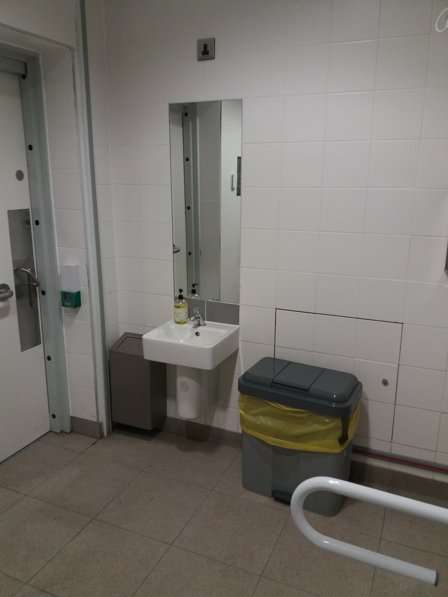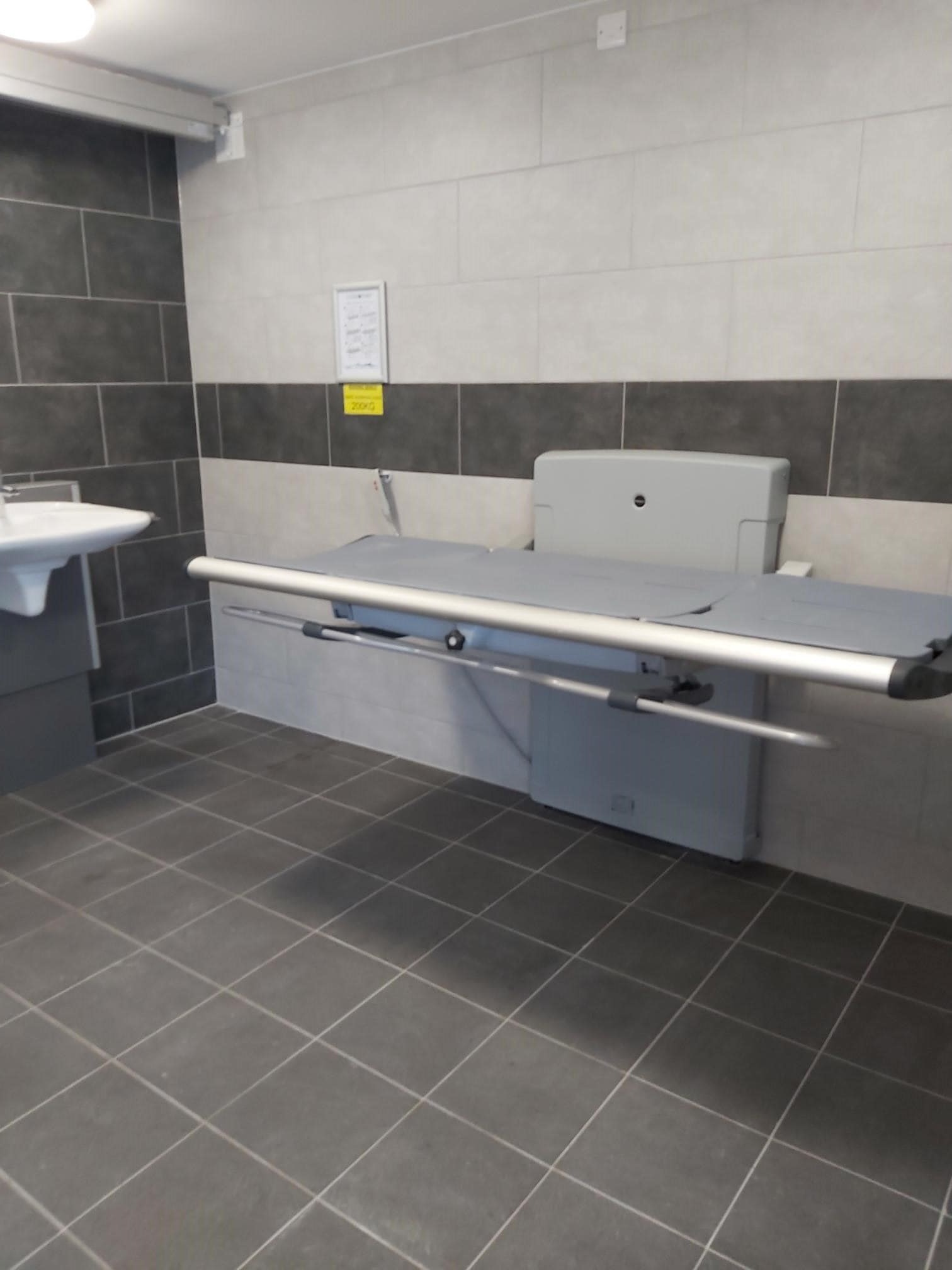 FACILITIES: Bench – Height Adjustable, Adult Sized, Free Standing | Hoist – Ceiling | Peninsular Toilet | Non-Slip Floor | Floor Space (sq. m) – 7 | Emergency Alarm | Privacy Screen | Paper Roll | Radar Key | Managed | Locked Colostomy Shelf