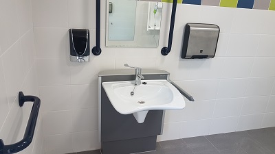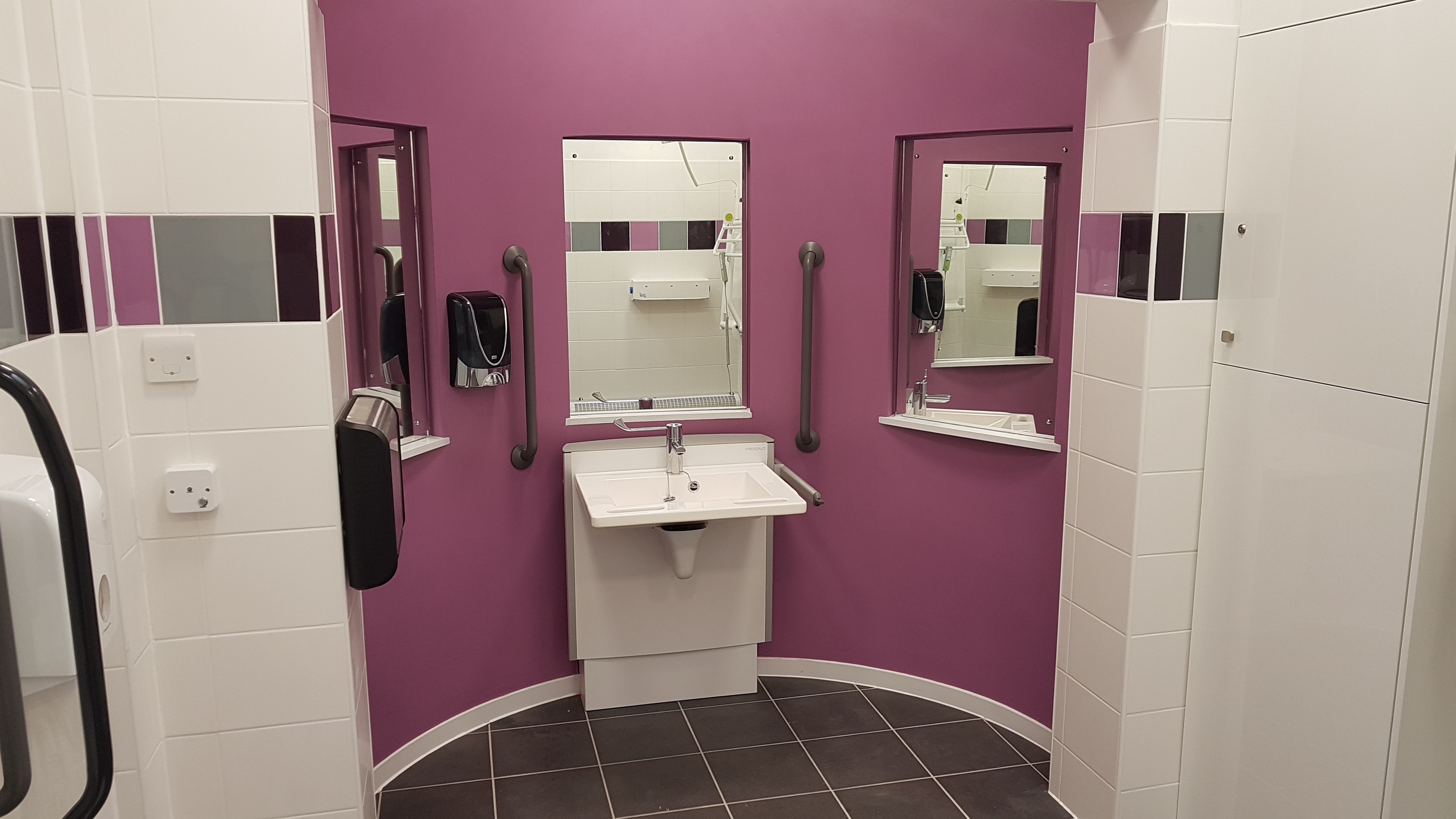 FACILITIES: Bench – Height Adjustable, Adult Sized, Wall Mounted | Hoist – Ceiling | Peninsular Toilet | Height Adjustable Washbasin | Non-Slip Floor | Floor Space (sq. m) – 12 | Emergency Alarm | Paper Roll | Radar Key Managed | Locked | Colostomy Shelf