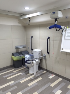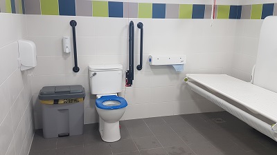 FACILITIES: Bench – Height Adjustable, Adult Sized, Free Standing | Hoist – Ceiling | Peninsular Toilet | Height Adjustable Washbasin | Non-Slip Floor | Floor Space (sq. m) – 11 | Emergency Alarm | Privacy Screen | Paper Roll Radar Key | Managed | Locked | Colostomy Shelf
