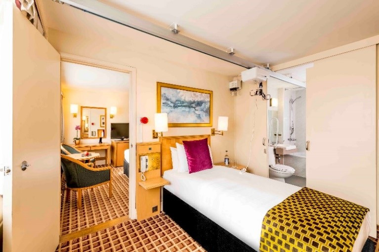 The ten en-suite accessible rooms combine comfort and smart design to provide the perfect space for those requiring customized facilities. All rooms have been equipped with assistive technology and within reach enhancements, including power assisted doors, functionally adapted furniture, Clos-o-mat toilets, bedside control of the tv and lights and a door entry phone system. Interconnecting rooms available on request. Two of the accessible rooms have a ceiling track hoist.