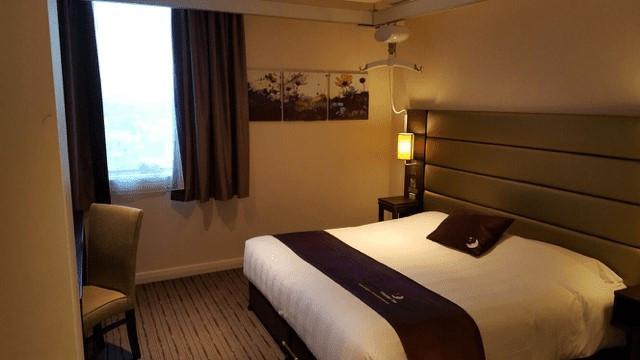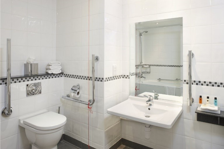 Spacious and well-designed. Most wheelchair seats measure 480mm in height, so we’ve designed our accessible beds and baths with that in mind. A double or kingsize 480mm high Hypnos bed, a comfy duvet, firm and soft pillows, plus a handy desk with tea and coffee making facilities. Wide entry en-suite with grab rails, assistance cords, and non-slip surfaces. Some hotels have lowered baths and some hotels have wetrooms. Enjoy our free standard Wi-Fi*, plus a Freeview TV. The hotel has numerous accessible rooms, 9 of which have ceiling track hoists through to the bathroom. 8 of these rooms have a wheel in shower and the other has a lowered bath.