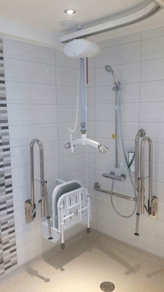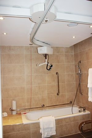There’s 26 accessible rooms and two of these have OpeMed OT200 ceiling track hoists, one room has the track running from the bed into the bathroom, this services the sink, toilet and lowered bath. The other only has the track in the bedroom but comes with a roll in shower and shower chair.