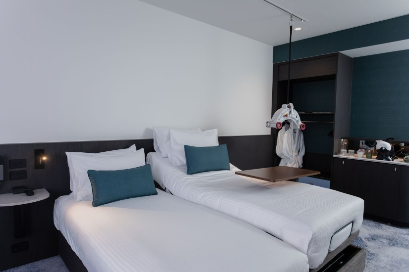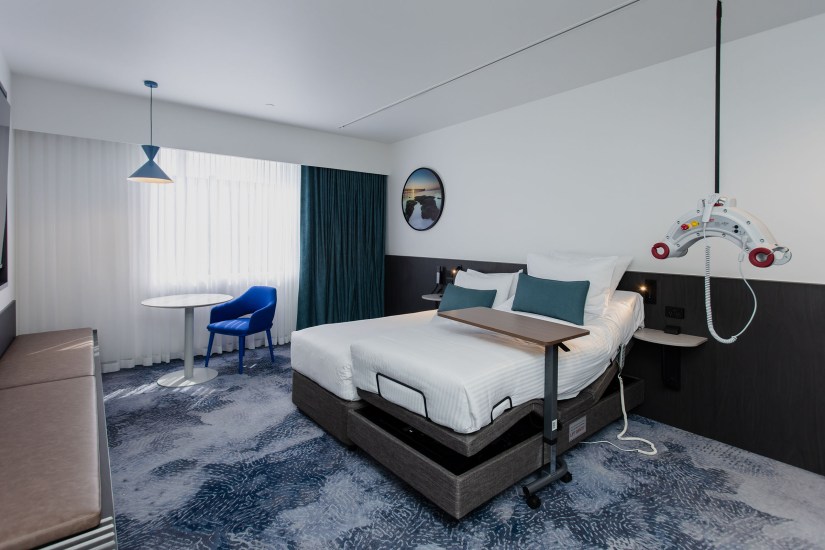 Spacious, stylish, and thoughtfully designed, our 10 Superior Accessible Rooms are 40 sqm in size and provide enhanced comfort and ease of movement for all guests. Each room features a luxurious king-size bed, accessible ensuite bathroom, tea and coffee making facilities, a comfortable chaise lounge, dedicated workspace, a 65” flat-screen TV, and complimentary Wi-Fi. 7 rooms offer an interconnecting option with a Superior Twin Room – ideal for families, carers, or companions. 1 room includes an adjustable electric bed with ceiling hoist for guests with higher accessibility needs.