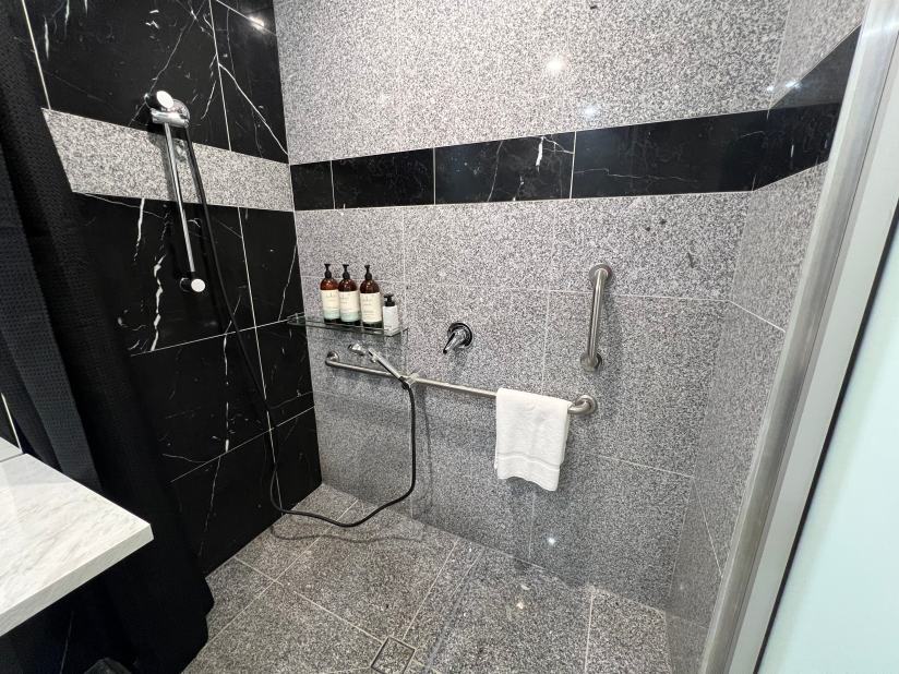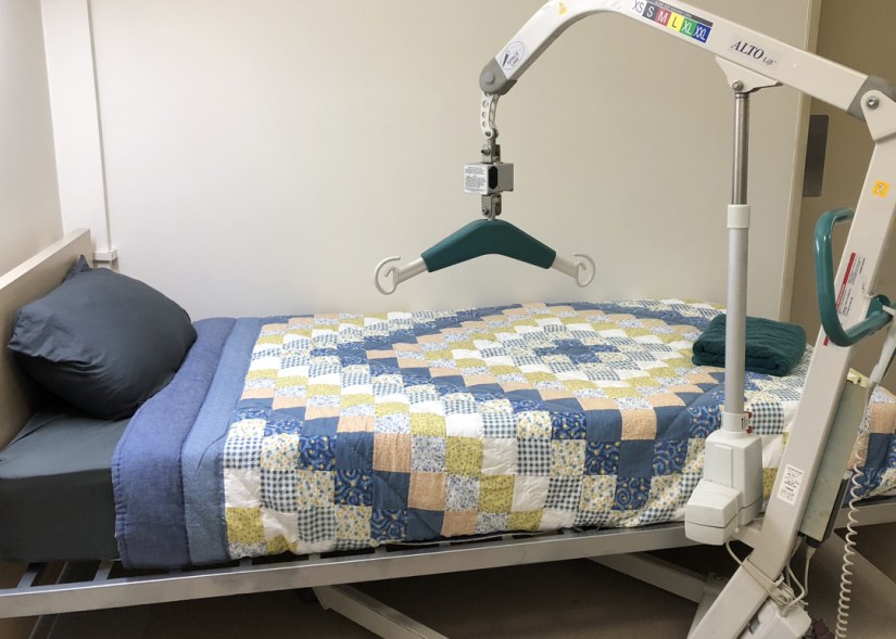 The in-room hospital bed is fully equipped with electronic hand controls for maximum comfort. A lifter (mobile hoist) is also available on request, please bring your own harness, as well as a commode. Their bathrooms have been designed for your comfort with adjustable shower heads and are equipped with grab rails and a shower bench. The basins, vanities, and towel rails have been lowered.