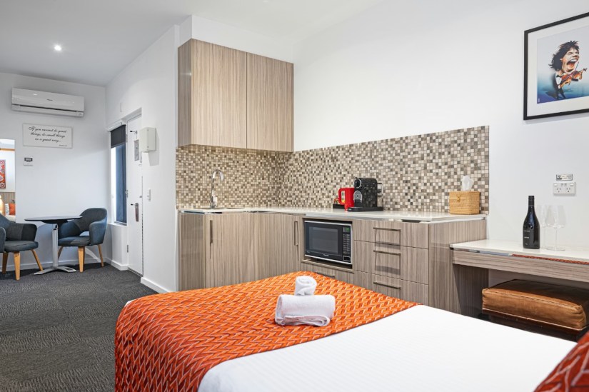 All rooms feature pillow top queen size beds. They offer Smart LCD TV’s, a Kitchenette, a coffee machine, a mini bar, HiSpeed complimentary WiFi, and limited car parking if required. The kitchenette is equipped with a microwave, plates and utensils and a Nespresso coffee pod machine.