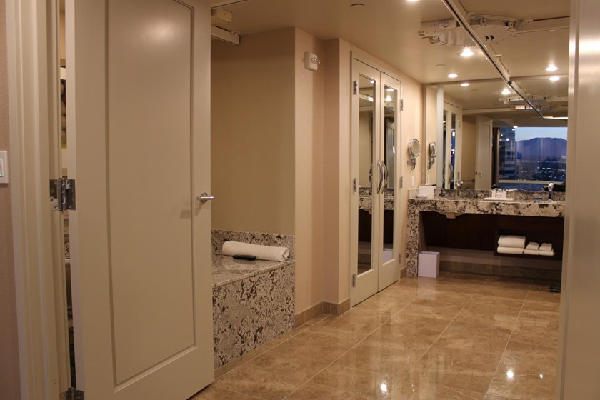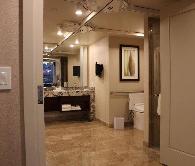 From corner views in every room to an in-room tablet for ordering and room controls, ARIA’s Deluxe Rooms include a world of unexpected amenities. There’s a number of accessible bedrooms with ceiling track hoists, the track runs from the bed into the bathroom where turn tables allow you to access the sink, toilet and wheel in shower. Additional equipment can be arranged by request.