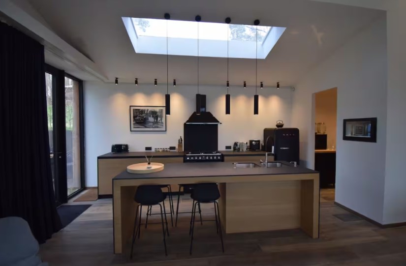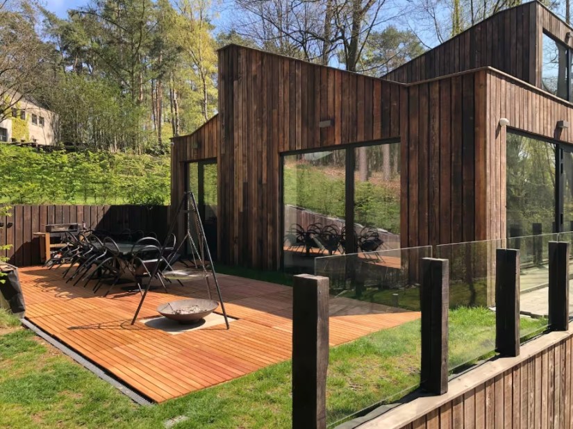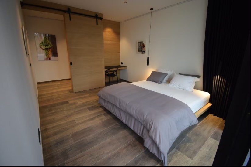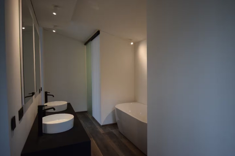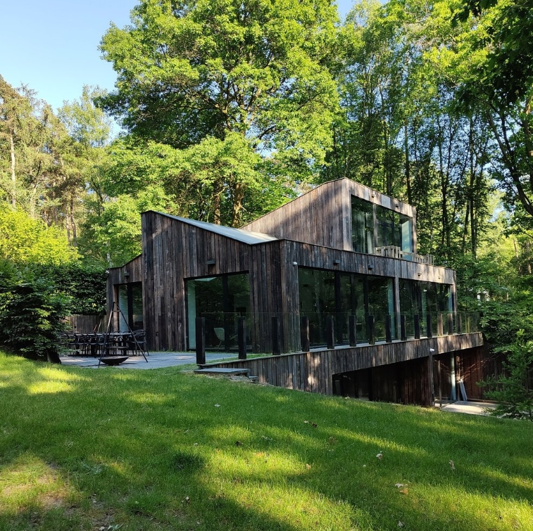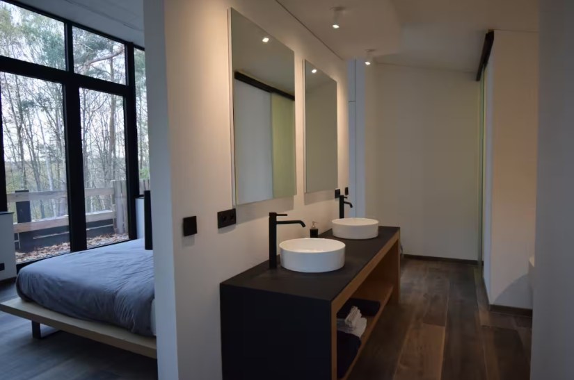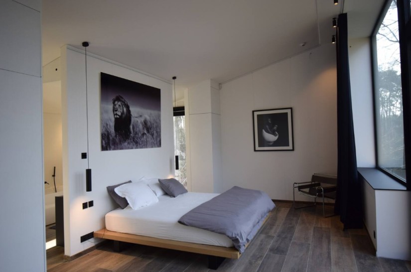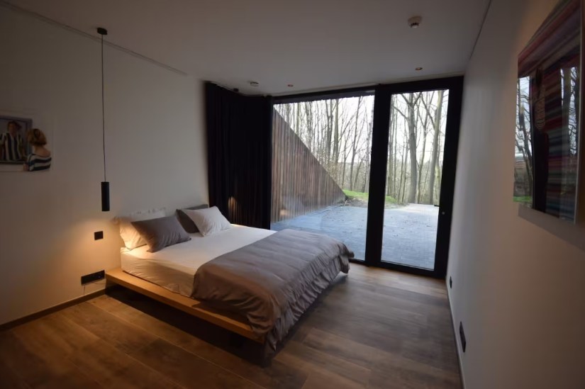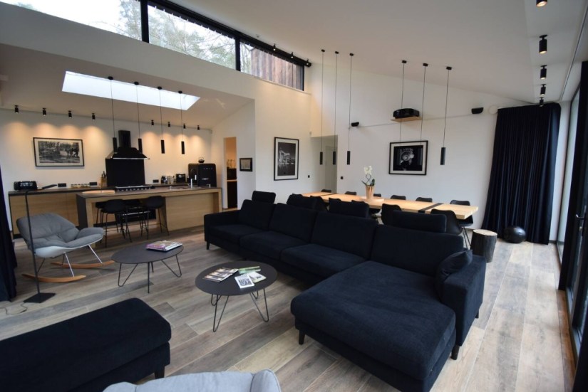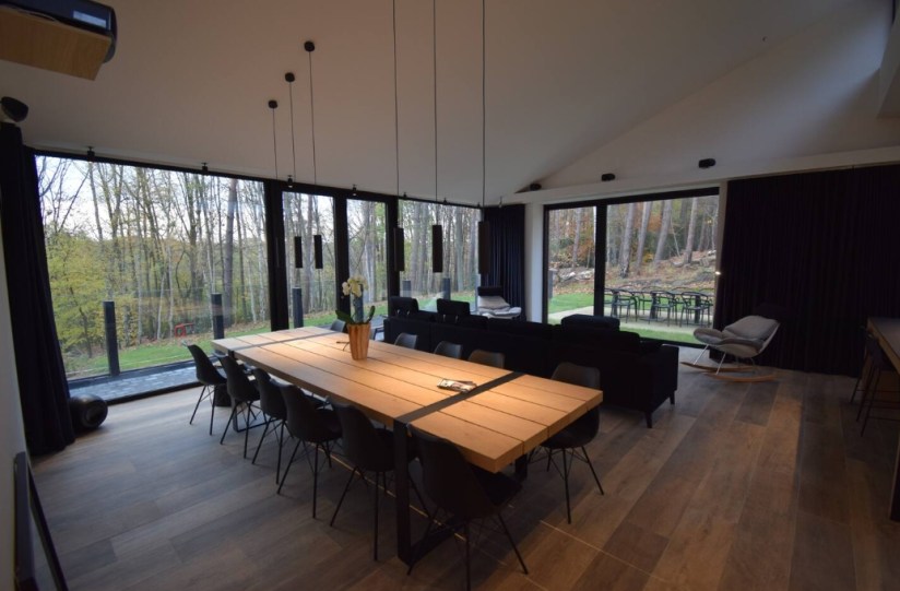 The living room features a fully-equipped SMEG open-plan kitchen with large stove, pantry and separate storage area, a vast dining room and a 12-person lounge with panoramic views of the forest. The house is entirely managed by a state-of-the-art home automation system with touchscreen controls, large projection screen (VOO decoder input, Apple TV, Chromecast and HDMI) and airplay sound system, and free wifi. Outside there’s a terrace with garden furniture, a barbecue and private parking.