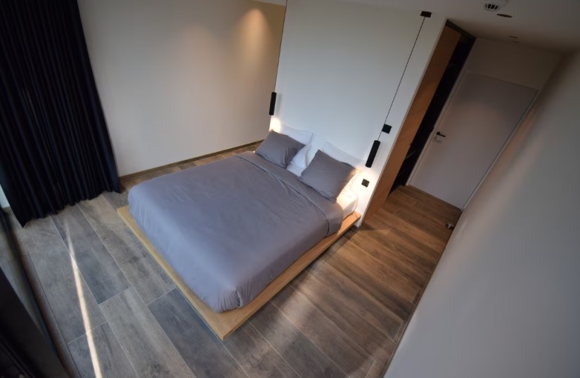 - Living area has a large sofa, projection screen, Apple TV, sound system & dining table