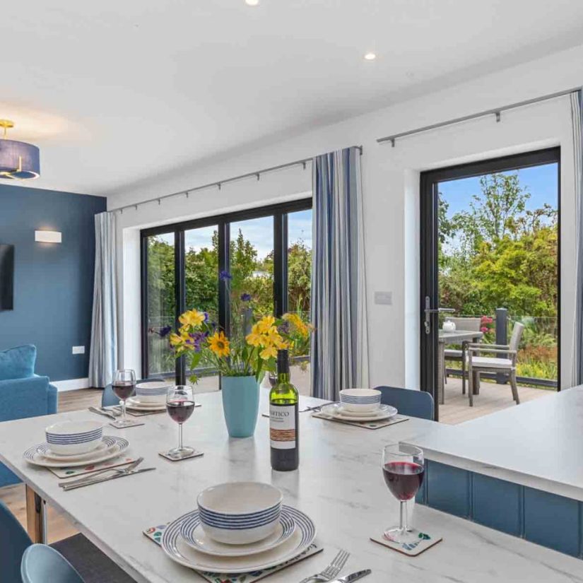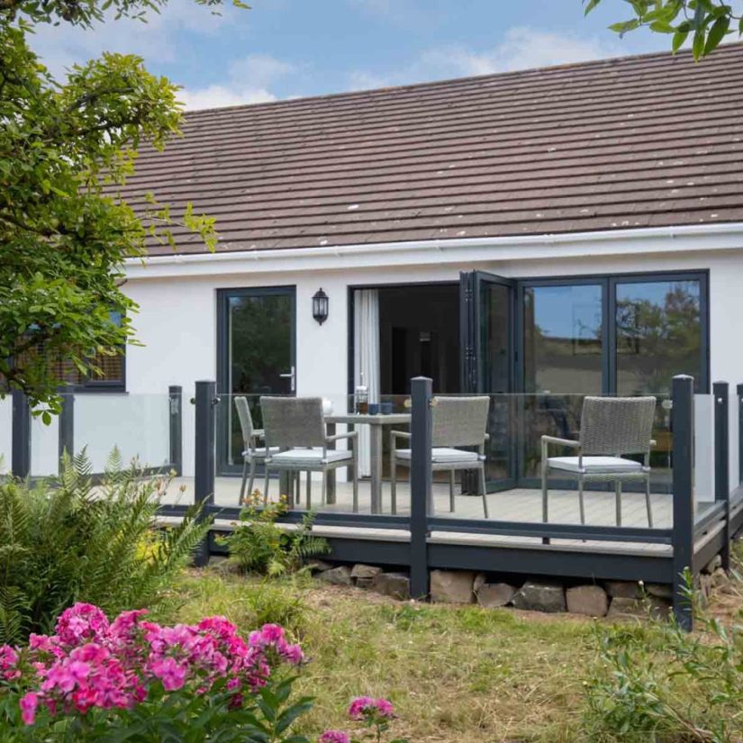 The newly fitted kitchen has a dishwasher, washing machine and a wheel-under breakfast bar with free-standing seating. There is a wall mounted oven and microwave, induction hob and pull-out kitchen storage for ease of access. The living room has comfortable sofas and a large wall-mounted TV. According to needs, we can provide either a Lento riser/recliner chair or a Lento Care Chair for guest use. Bi-fold doors open from the living room onto a level terrace/deck with views over the adjoining countryside.