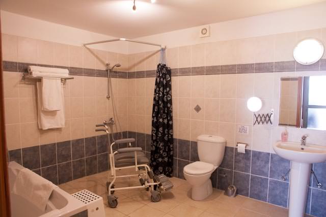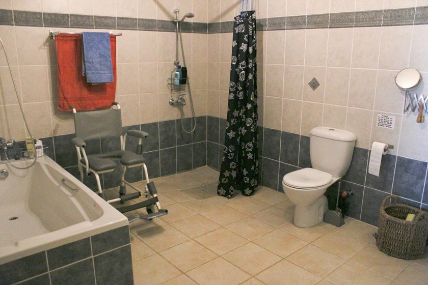- Accessible wet room with a wheel in shower, shower chair and bath