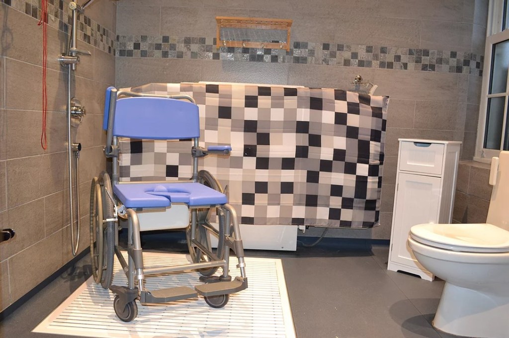 - Wet room with wheel in shower, shower chair, accessible basin and raised toilet