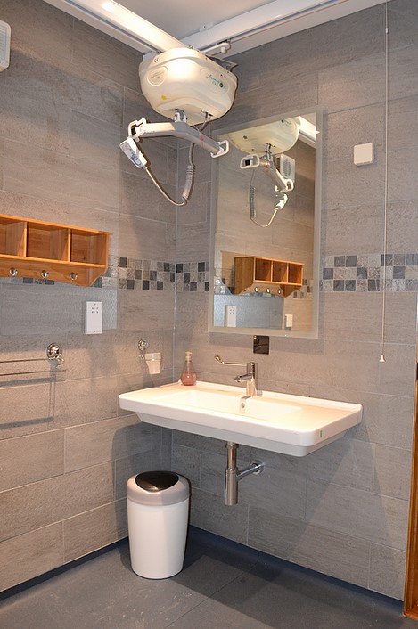 - Ground floor wet room with wheel in shower, height adjustable shower bench, wheeled shower chair, X-Y ceiling hoist, lowered basin and clos-o-mat toilet