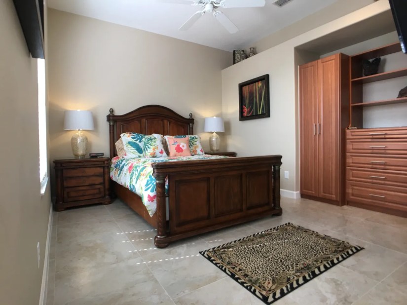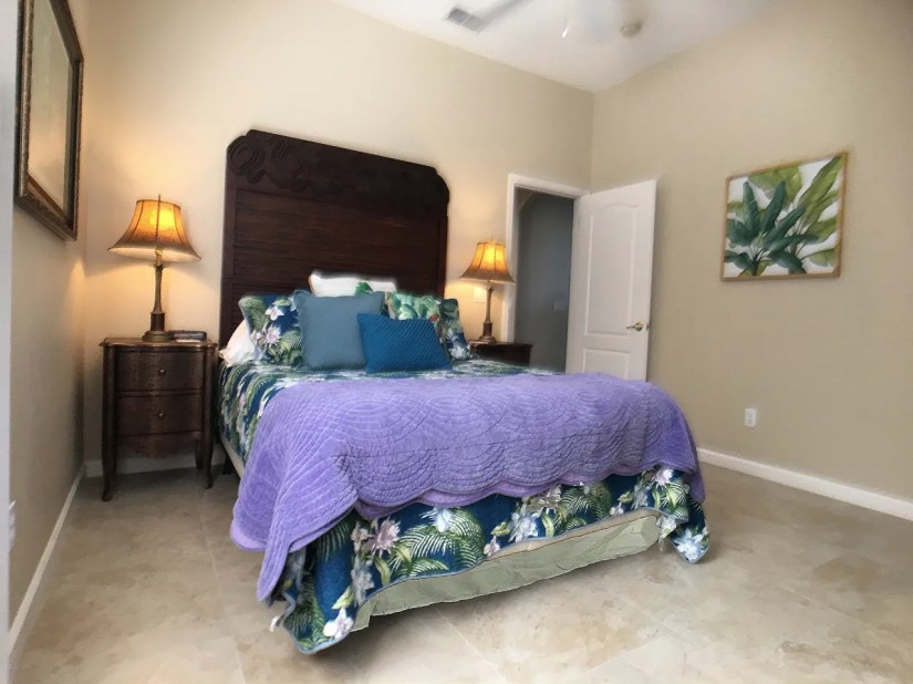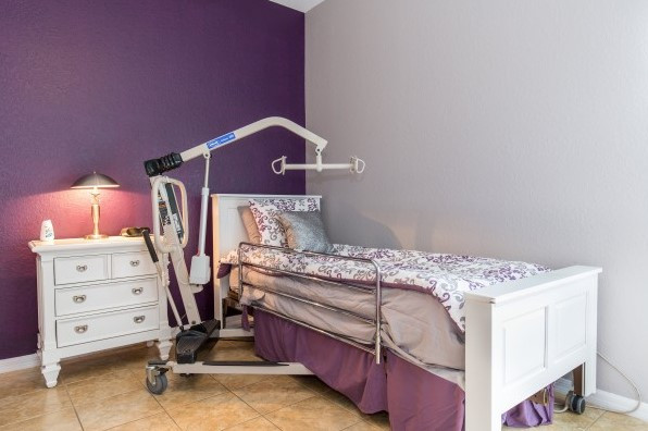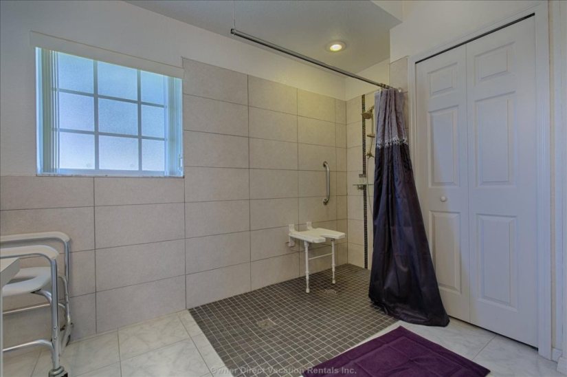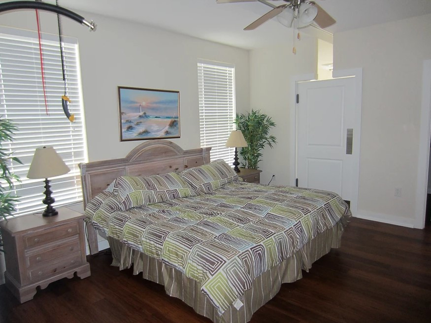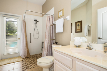This wheelchair accessible vacation rental features private bedroom retreats for guests to relax and rest. Spa like bathroom with roll in shower, an accessible sink, and even a Hoyer style pool lift.