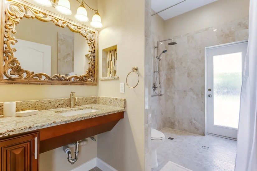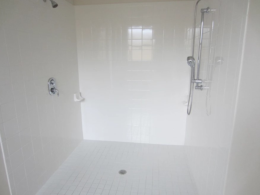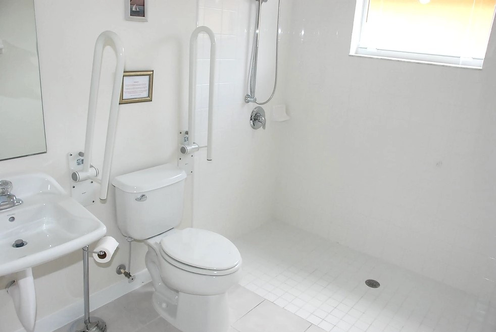 - Bathroom has a wheel in shower, shower seat and accessible sink