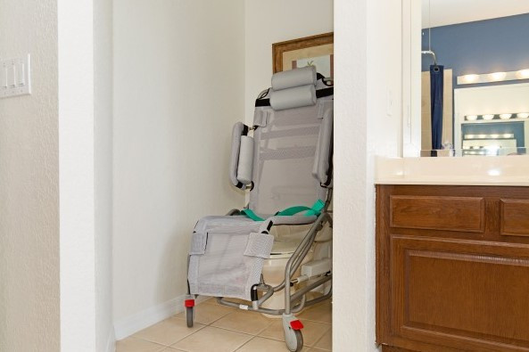 - A Hoyer portable hoist and a wheeled shower chair are provided