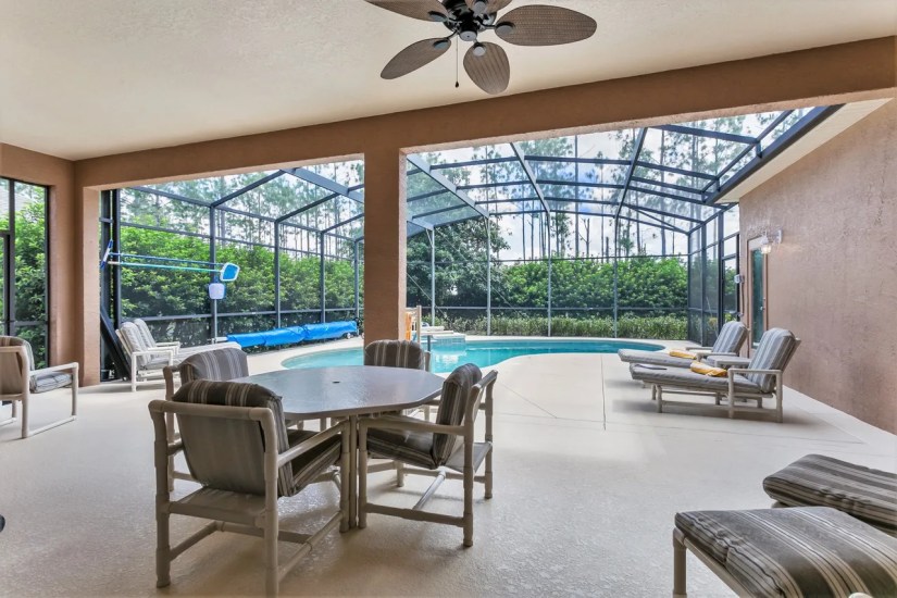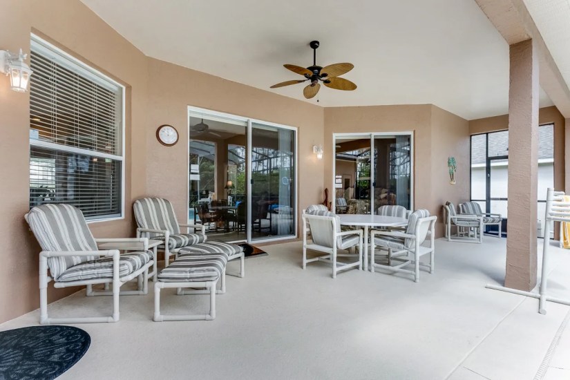 Our Private Pool is in one of the largest pool decks in highlands Reserve. There are 8 loungers and 8 chairs as well as a comfortably furnished covered lanai with out door Smart TV