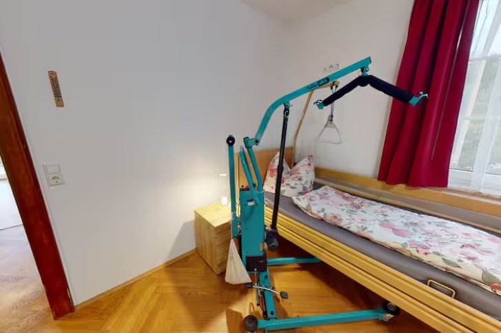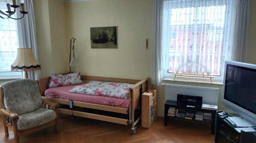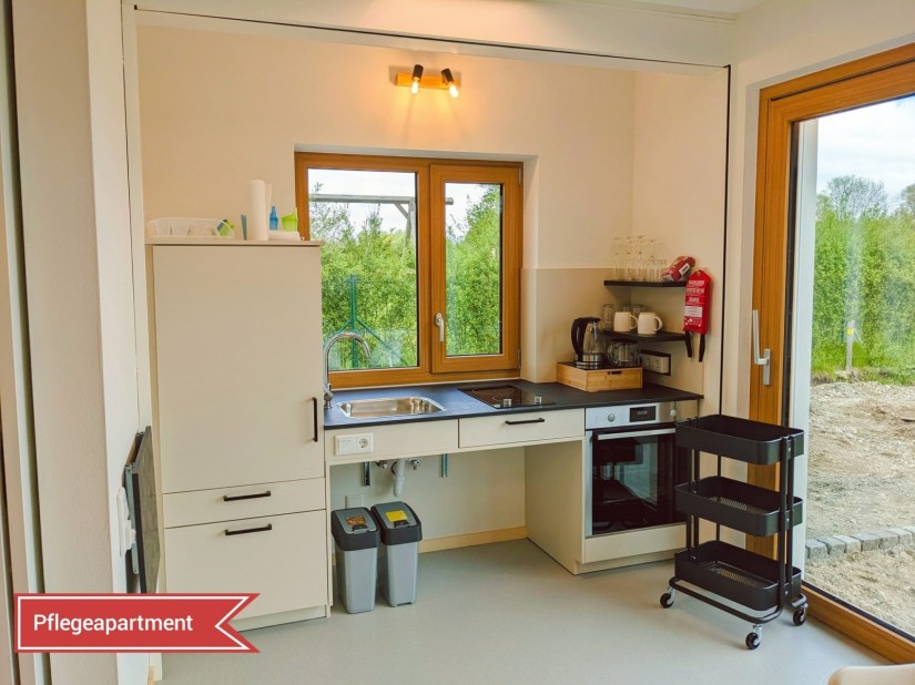 The care apartment has 50 square meters with your own terrace and panoramic view of the foothills of the Alps. A fully-equipped kitchen is included. It is completely accessible to wheelchair users according to DIN18040 and is on the ground floor without thresholds. All doors, patio doors and turning circles have 150cm. They are also suitable for nursing beds / hospital beds.