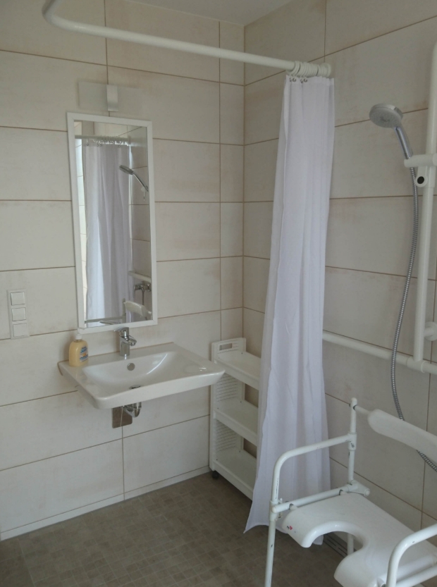 The apartment can cater for up to 3 people and has an open plan layout. The bedroom area has two standard single beds and a single, electric profiling hospital bed. A portable hoist can be provided if required. The large wet-room contains a wheel-in shower, accessible height adjustable sink, foldable shower chair and a shower bed. Care can be provided if required by an external company for an extra charge