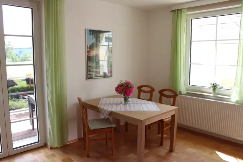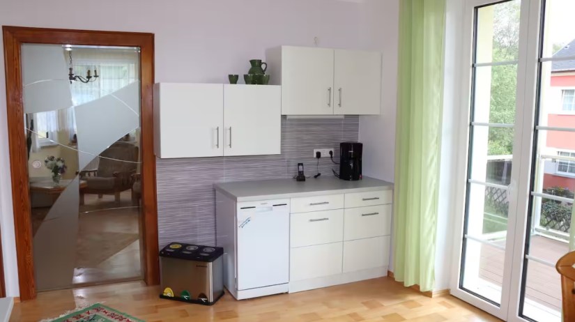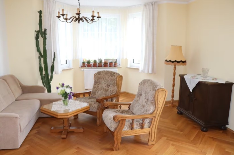 The Abtwald apartment is certified by the Saxony Tourism Marketing Association and completely complies with the DIN standard “barrier-free”. This apartment is suitable for five people. The main bedroom has a double bed and a single, electrically adjustable hospital bed, another hospital bed can be found in the living room. Other accessible features include a mobile hoist, wet room with wheel-in shower and an accessible wash basin, plus the kitchen has a height adjustable worktop with hob and sink.