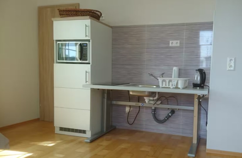 This apartment has its own accessible kitchen with all mod cons, a wheelchair accessible sink and hob, lowered cupboards and refrigerator. The refrigerator has a built-in temperature monitor for medications that need to be refrigerated. The kitchen can be completely separated from the rest of the room at the touch of a button. Directly adjacent is your own terrace with a view of the mountains. Window handles are installed at a height suitable for wheelchair users. There is a second wheelchair accessible apartment on the premises but doesn’t have the same degree of accessibility. There’s also an apartment in the loft where family etc. could stay if booking with a large group.