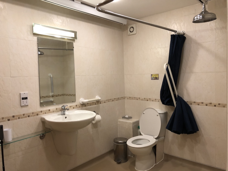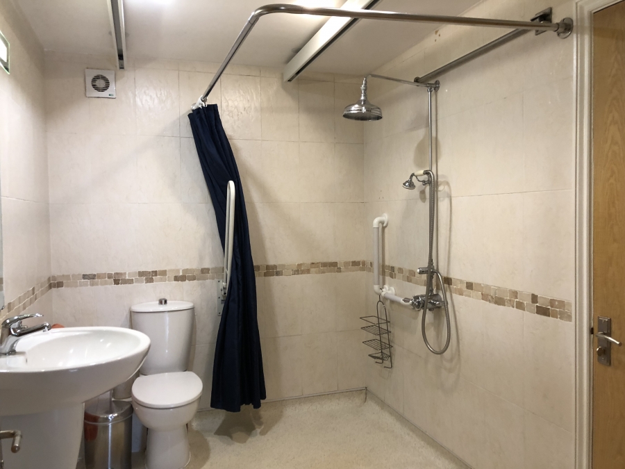 - Hoist runs into the wet room with level access shower, wheeled shower chair