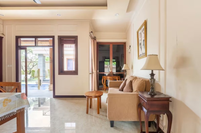 - Living area has a sofa, dining table, Sound system & 55″ Satellite TV with Netflix