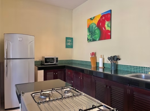 - Kitchen with microwave, fridge / freezer, oven & hob