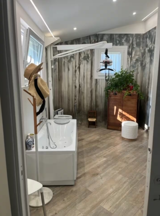 On the ground floor, there is the single bedroom with accessible and independent entrance from the garden, equipped with a ceiling lift and large bathroom with a flag lift, single whirlpool tub, shower, sink suitable for wheelchairs, and toilet with hand shower. The large and equipped kitchen and the living room with fireplace are also on the ground floor.