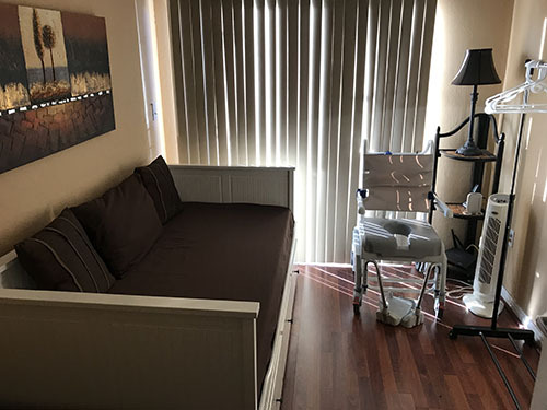 This 2 bedroom condo is located inside the gates of Las Vegas Country Club and sleeps 6 people. The master bedroom has a queen size bed and a ceiling track hoist. The bathroom has a wheel in shower with a wheeled shower chair and accessible sink. A wheelchair accessible minivan with hand controls is available to rent for $50 a day and there’s a parking space behind the property. There’s ramped access to the condo’s front door and out to the communal swimming pool area.