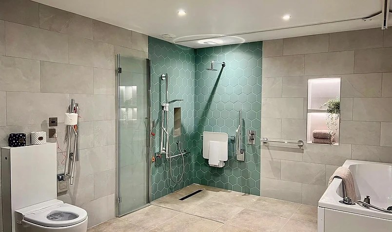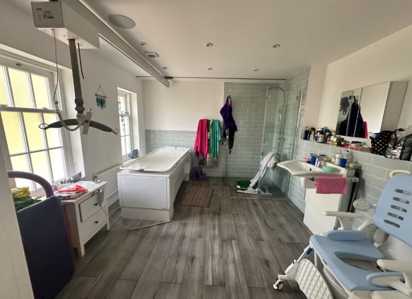 The house has a large luxury accessible bedroom with two profiling beds, two ‘Lento’ comfy chairs, Innova ceiling track hoist into accessible en-suite wet-room, kitchenette area and medical fridge. The ‘Fine and Able’ designer accessible bathroom has a ceiling hoist leading in from the large accessible bedroom, a step-free shower, wall-mounted shower seat, height-adjustable bath for assisted bathing, bidet WC, two Rifton shower/WC chairs, height-adjustable shower trolley and wheel-under washbasin.