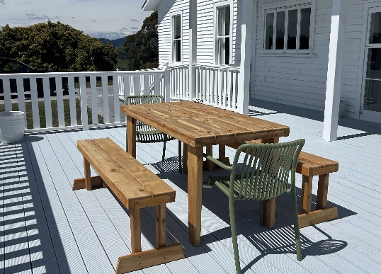 - Outside decking area with table, chairs and a BBQ