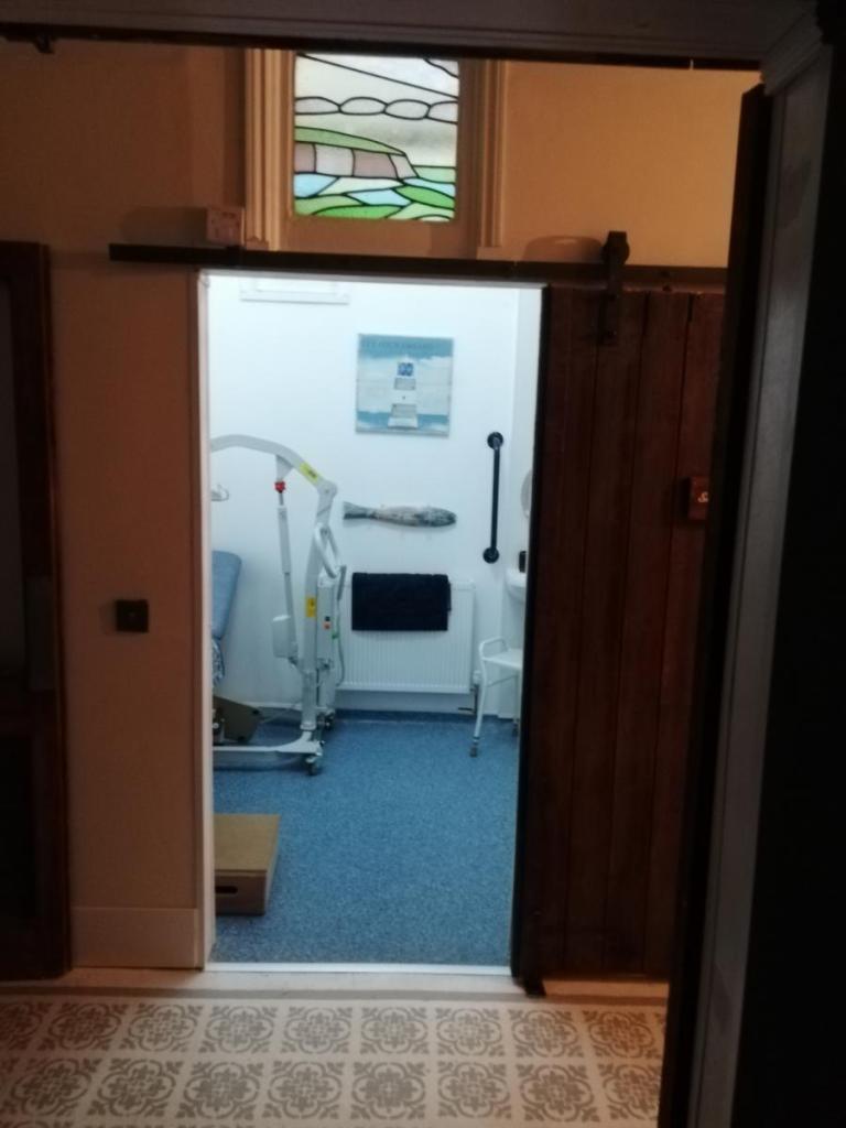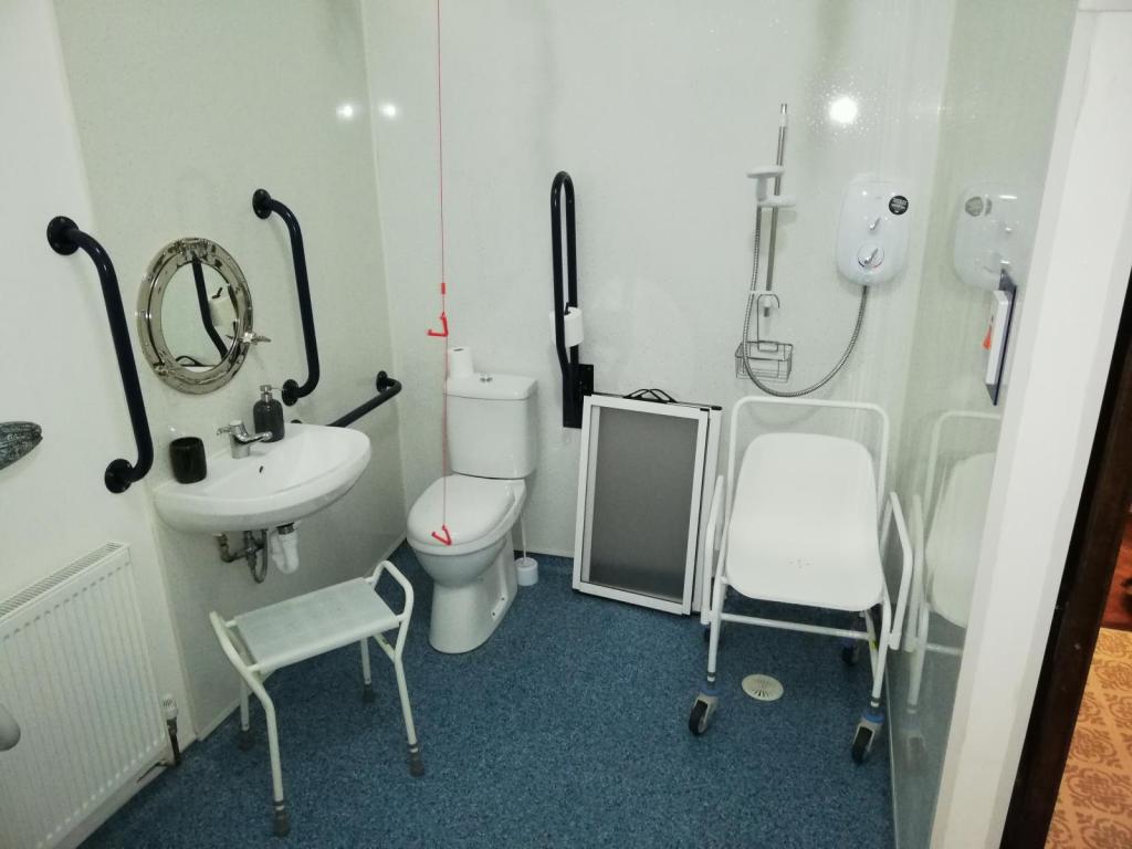 - Adapted wet-room with a wheel-in level access shower & wheeled shower chair